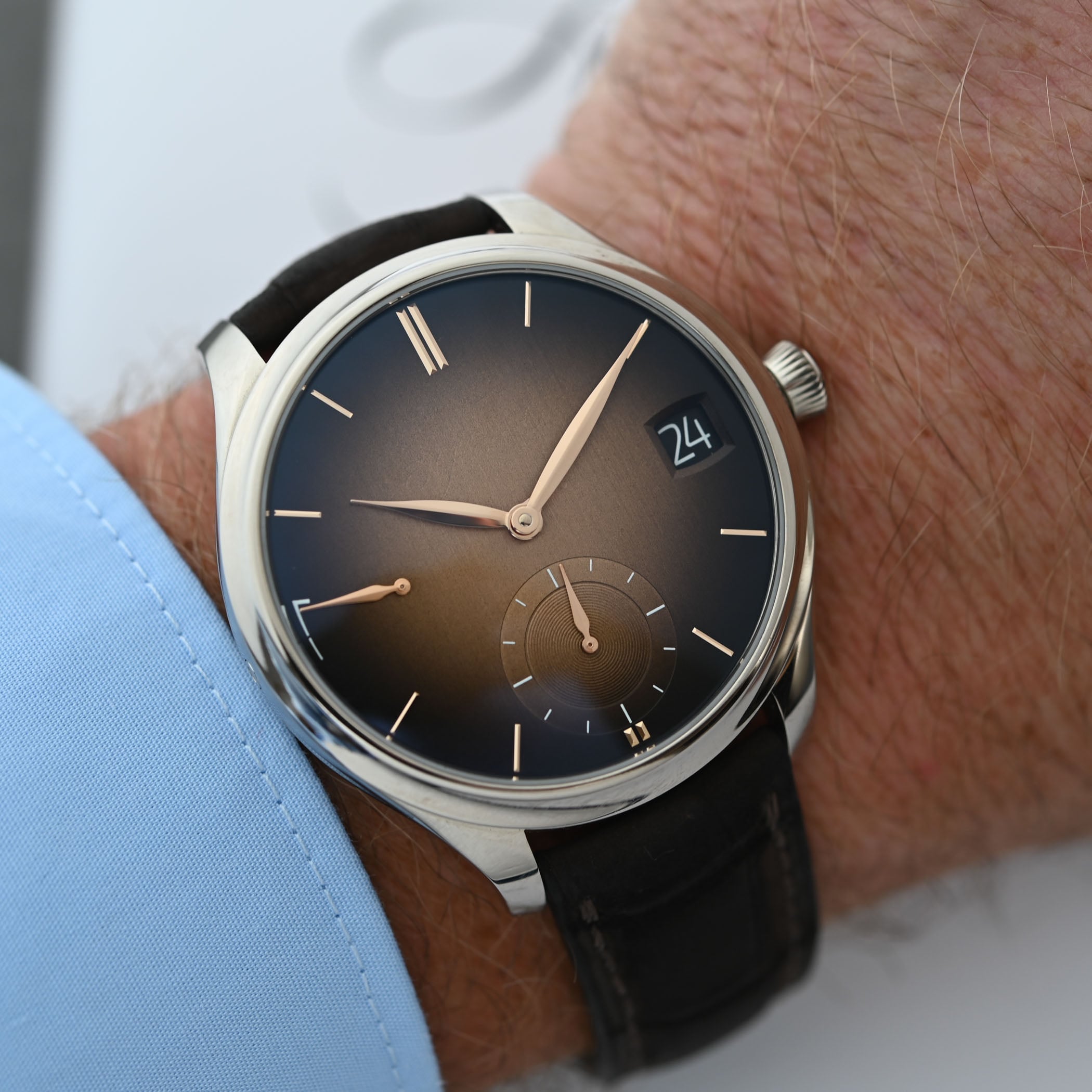Quick Facts – 42mm x 13.1mm – white gold case, brushed & polished – sapphire crystal front & back – smoked salmon fumé griffé dial – gold-plated leaf-shaped hands & indices – HMC 800, in-house automatic – 18,000vph – 7-day power reserve (168 hours) – hours, minutes, small seconds (hacking), power reserve, QP with big date, month, leap year (on the back) – interchangeable Moser escapement – brown alligator leather strap with pin buckle – CHF 54,000