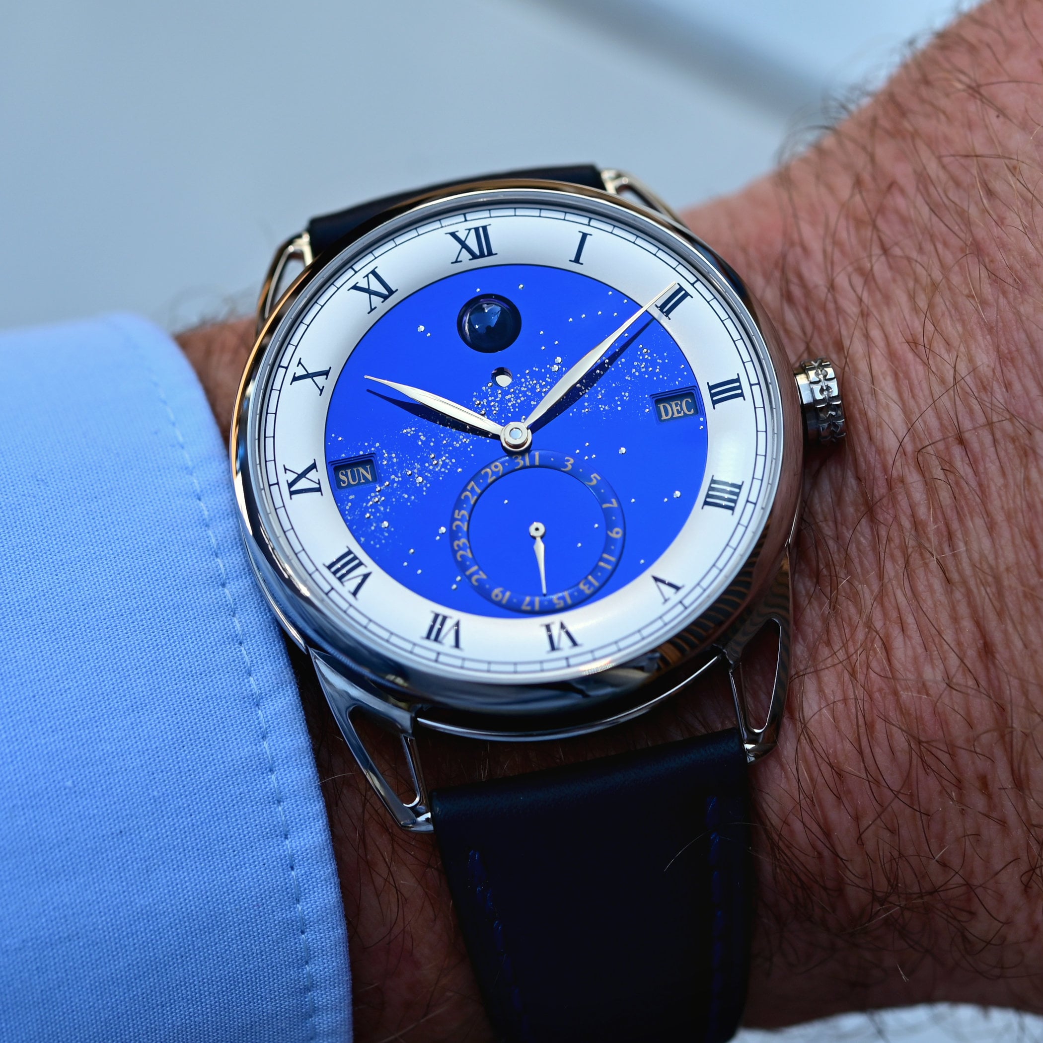 Quick Facts – 40mm 11.3mm – grade 5 titanium case, polished – hollowed lugs – sapphire crystal – open caseback – 30m water-resistant – blued polished titanium dial with hand-set starry sky – laser micro-milled Milky Way – yellow gold hands – calibre DB2005, in-house – manual winding – 339 parts – 28,800vph – 5-day power reserve – hours, minutes, QP with day, date, month, leap year & spherical moon phase – blue alligator leather strap with pin buckle – limited annual production – CHF 125,000 (excl. VAT)