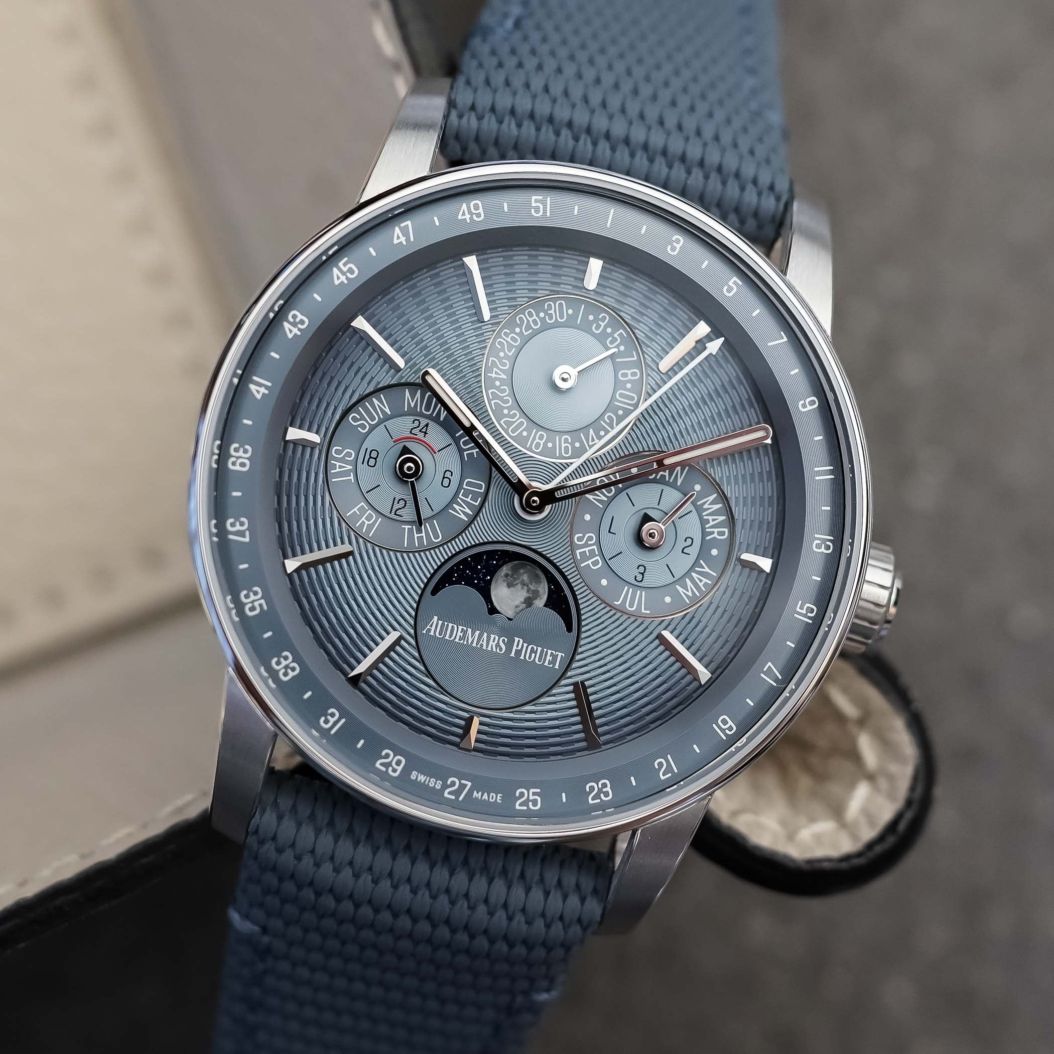 Quick Facts – 41mm x 10.3mm – white gold case, brushed & polished – sapphire crystal front & back – no correctors in caseband – 30m water-resistant – smoked blue embossed dial – snailed subdials – white gold markers & hands – calibre 7138, full in-house automatic – 422 components – 28,800vph – 55h power reserve – hours, minutes, QP with week, day, date, astronomical moon, month & leap year – blue textured rubber strap with white gold folding clasp – CHF 109,300