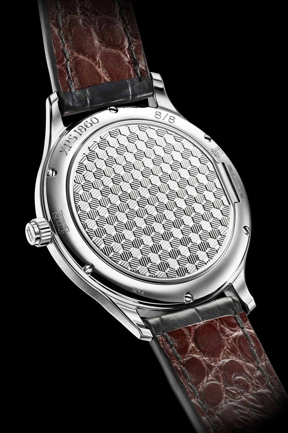 Like its red carpet siblings, the 40mm case is made from 18k white gold and has a slim profile of just 7.70mm – it is slightly thicker than the Cannes models because of the hinged officer-style caseback. The idea behind this hinged cover used on pocket watches was to protect the glass over the movement, as well as providing a blank canvas for engraving or other customisation choices. On this L.U.C XPS 1860, the pusher to open the caseback is integrated into the crown.
