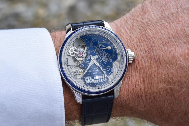 The watch comes with a CITES-certified hand-stitched blue alligator strap with a cognac-coloured lining dyed with plant pigments and a platinum folding clasp.