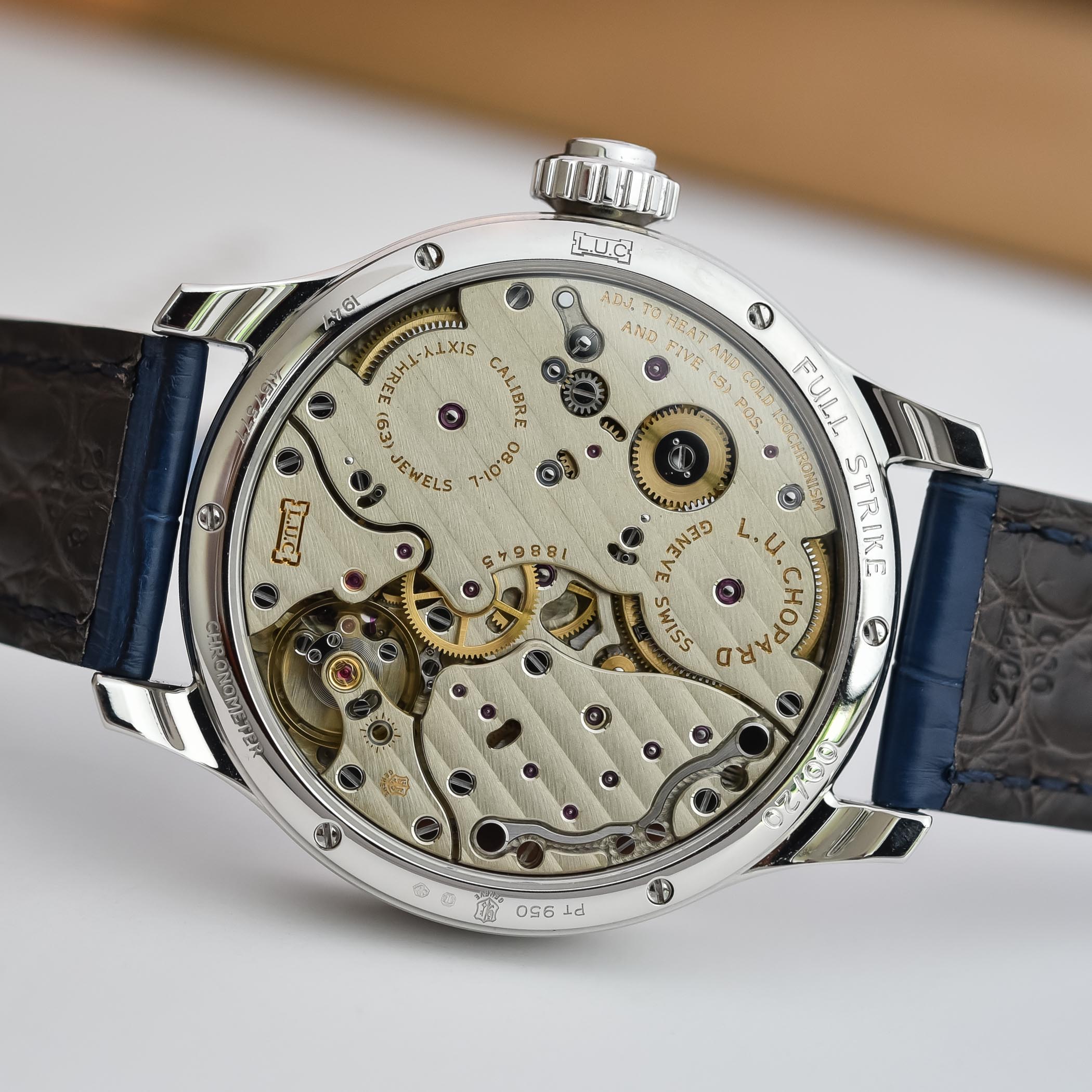 A platinum version of Chopard’s revolutionary crown-operated minute repeater with sapphire crystal gongs.