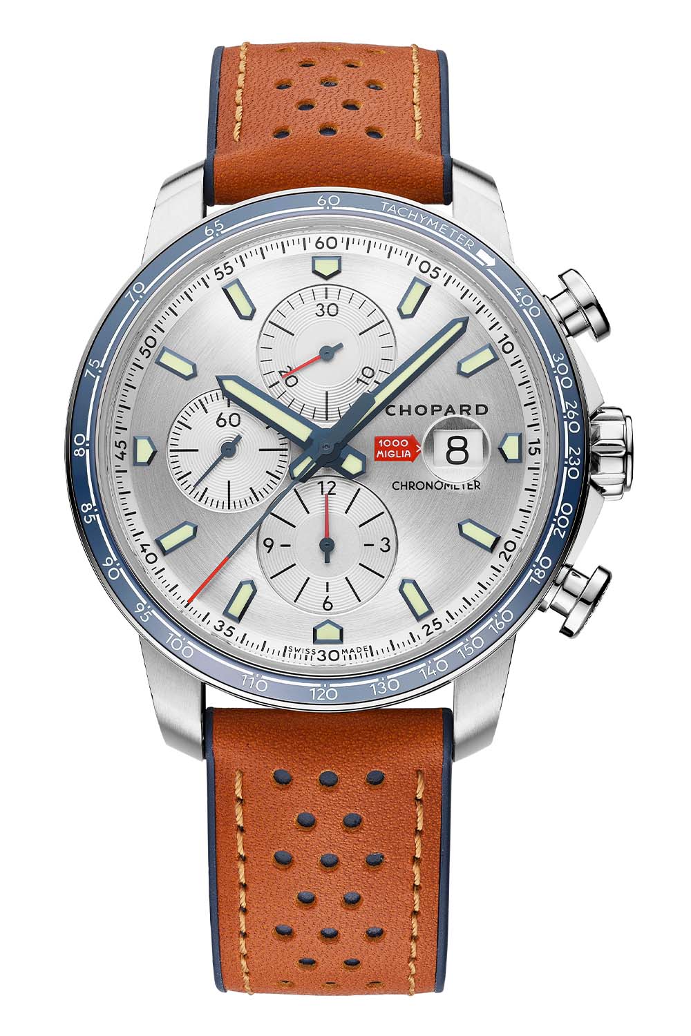 Contrary to the previous editions that mostly played on tones of grey, this new Chopard Mille Miglia 2022 Race Edition feels fresher and slightly more colourful. The two models are equipped with a dark blue ceramic insert on the bezel with a white printed scale. Similarly, the typical racing perforated leather strap with a tyre-like rubber lining combines light brown with blue colours. In both editions, the strap is attached to the wrist by a stainless steel triple folding clasp.