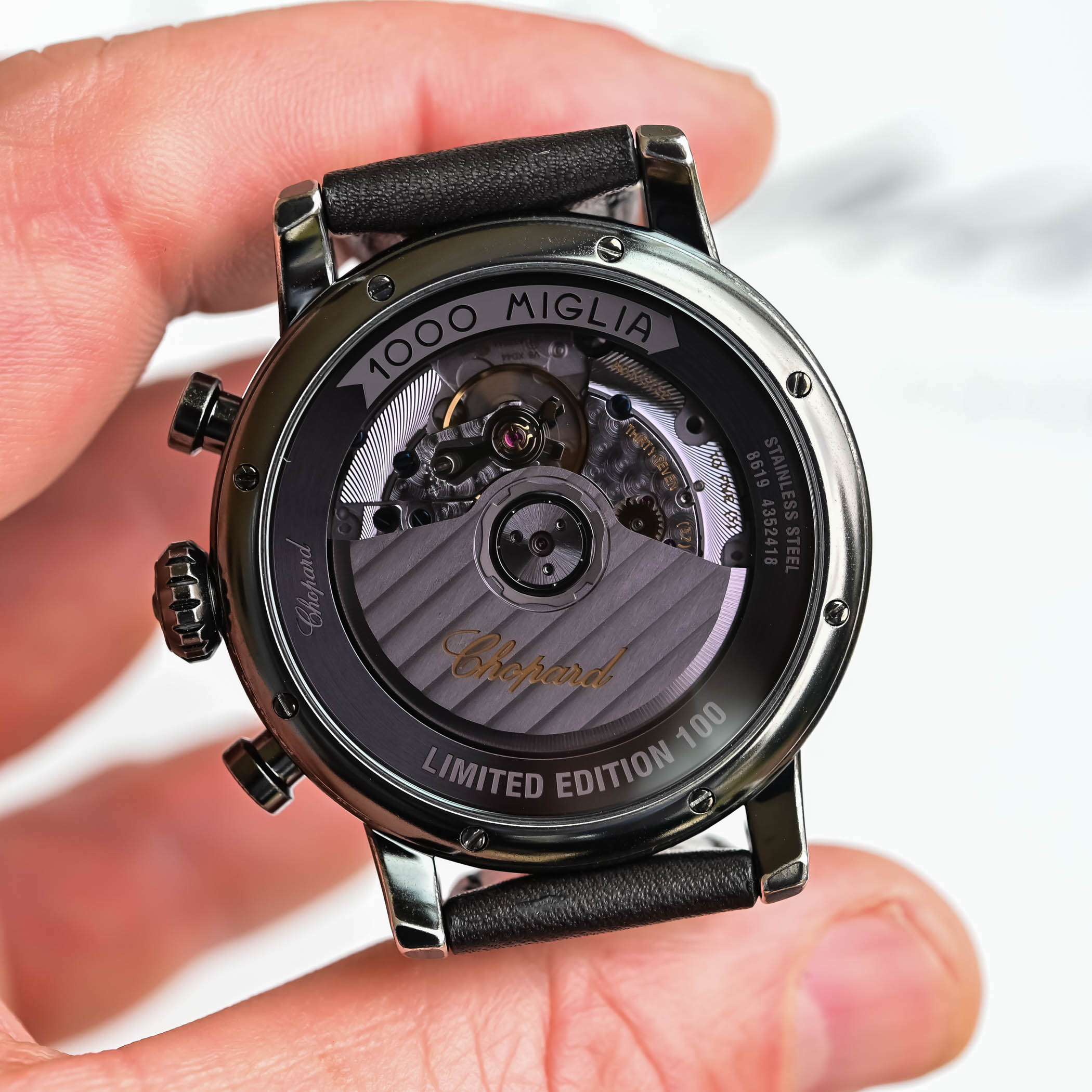 While the new Mille Miglia Classic is crafted in Lucent Steel, it has been given a dark diamond-like carbon (DLC) coating and a novel tribofinishing process that abrades the surface using vibrating ceramic media. In layman’s terms, the process softens the edges and gives the steel a rugged, worn aesthetic reminiscent of the patina on vintage cars. Like other Classic models, the notched crown, resembling a petrol tank cap, is topped with a steering-wheel motif.