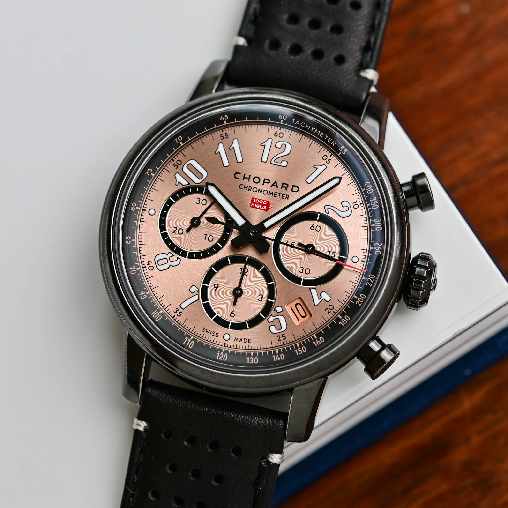 The large vintage-style painted Arabic numerals and the baton hour and minute hands are coated with Super-LumiNova, and the date window, angled at 4:30, has a salmon background. Red accents are used to highlight the 1000 Miglia arrow on the dial and the tip of the central chronograph seconds hand. Highlighting its retro spirit, a glass-box sapphire crystal over the dial lets more light into the case and deepens the dial opening.