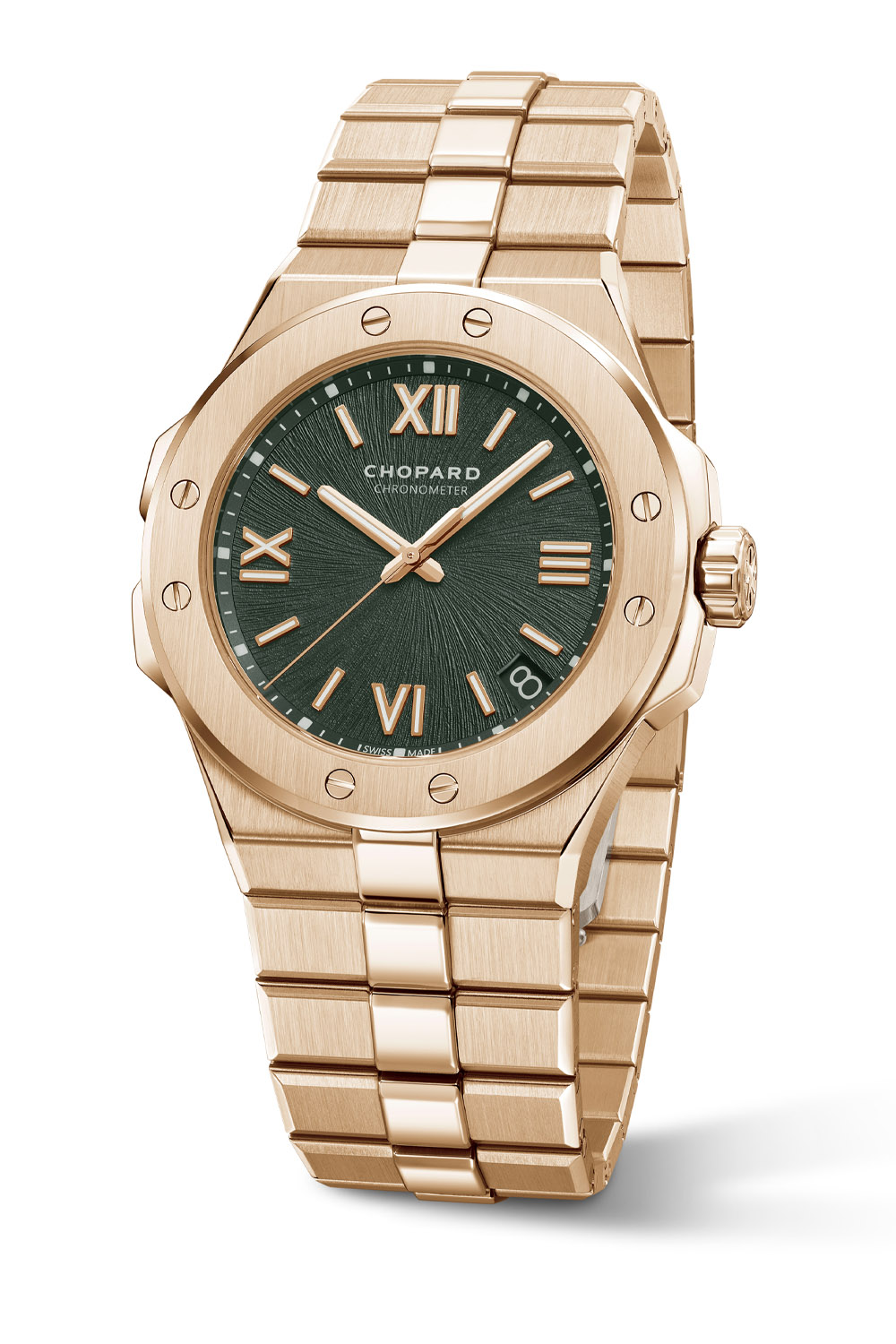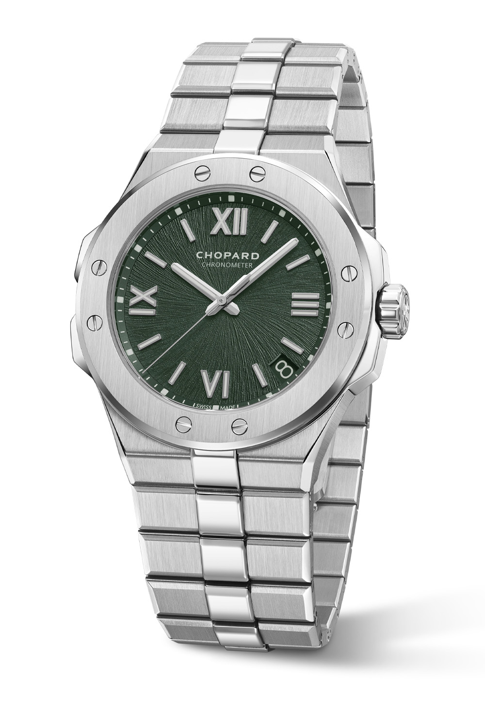 Inspired by the forests carpeting the Alpine biotope, the pine green dial of the Alpine Eagle features the characteristic striated pattern to suggest the iris of an eagle’s eye. Using a brass blank stamped with an irregular sunburst pattern with a pine green PVD treatment, the striations radiate from the centre. Rhodium-plated Roman numerals and hour markers are applied to the dial and treated with Grade X1 Super-Luminova, like the baton-style hour and minute hands. The signature eagle feather acting as a counterweight can be seen on the central seconds hand, and the date is perched a 4:30 with a green background and light green numerals to match the inscriptions ‘Chopard’ and ‘Chronometer’ at noon and the peripheral minutes track. A glareproofed scratch-resistant sapphire crystal protects the dial.