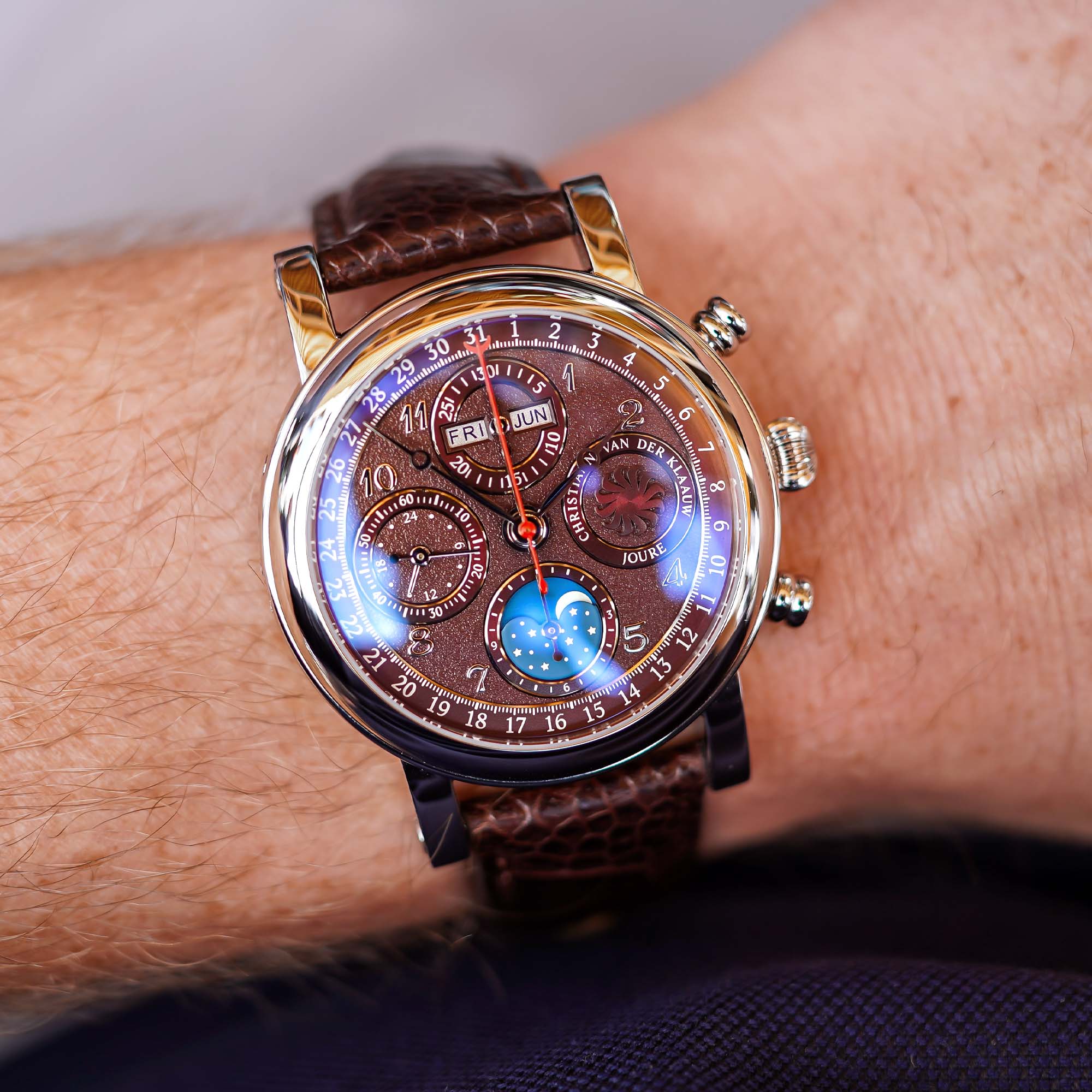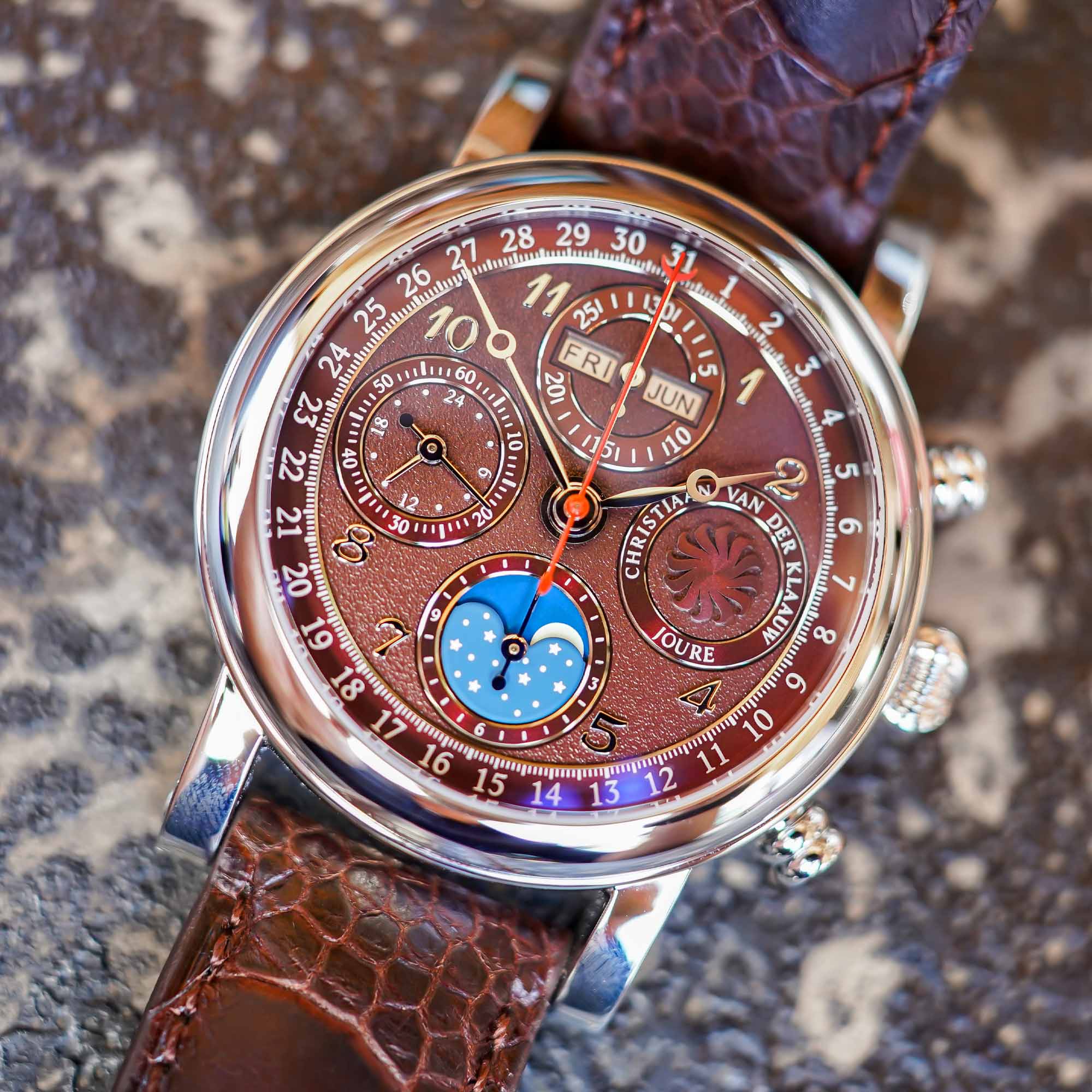 Dutch watchmaker Christiaan van der Klaauw started producing astronomical complications in 1974 and earned worldwide acclaim following his creation, in 1999, of the smallest mechanical planetarium in the world with real-time orbits of the planets in the confined dimensions of a wristwatch. Ten years later, in 2009, Christiaan van der Klaauw handed over the reins to Dutch designer and close friend Daniël Reintjes and in 2022, master watchmaker Pim Koeslag (ex-Frederique Constant) acquired a majority stake in CVDK and, thankfully, has retained the focus on astronomical watches. The first watch to emerge from the atelier led by Koeslag was the Ariadne, a revamped take on an existing model with a chronograph and complete calendar complemented by a moon phase display. First released with revisited silver, grey and navy blue dials and turquoise and salmon limited editions for Dutch retailer Reijersen, Monochrome got a sneak peek at the new version of the classic Ariadne with a richly coloured and textured burgundy dial.