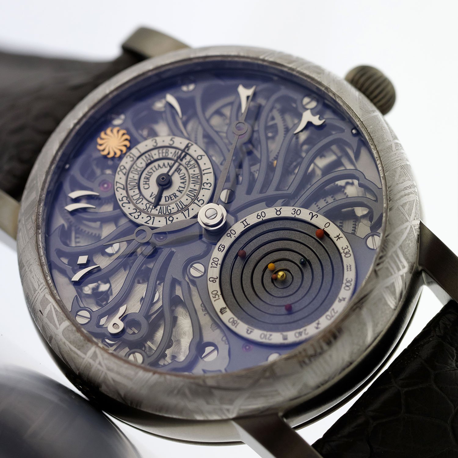 Christiaan van der Klaauw is one of the most famous watchmakers in the Netherlands and probably worldwide when it comes to hand-made, astronomical complications. Probably the most impressive achievement of his career was the development in the 1990s of the planetarium wristwatch, which became the world’s smallest mechanical planetarium. A planetarium is a device that tries to illustrate accurately the motion of the solar system and its planets revolving around the sun. With the recent Grand Planetarium Eccentric, CVDK presented the first of its kind to be fitted on a wristwatch and capable of displaying the 8 planets of our solar system. But there’s another important watch, built in 1995, that started it all: the CVDK Kepler’s Planetarium Clock. If it isn’t as complete as the recent model, the miniaturisation of the complication is spectacular.