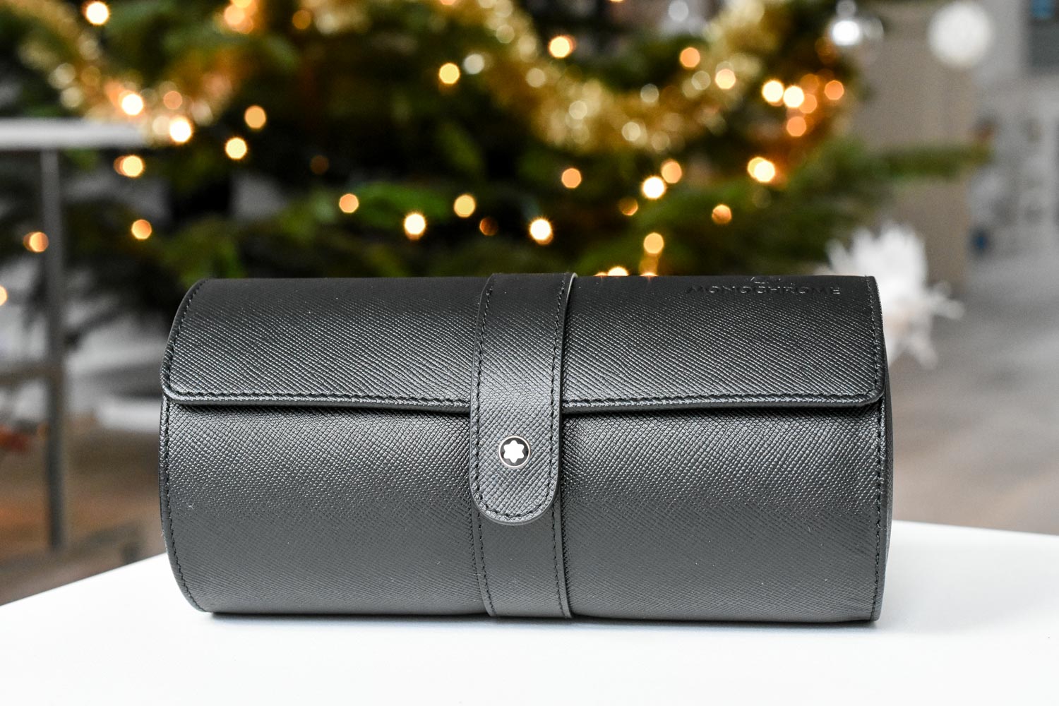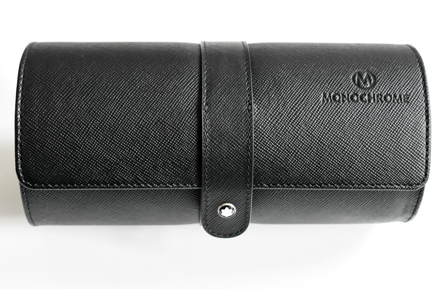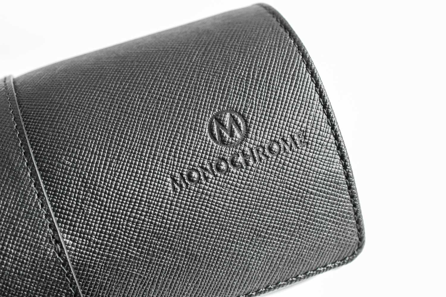 These watch pouches, or travel watch rolls, for two watches are made of so-called ‘sartorial’ leather. You can strap two of your watches each around one of two cushions inside, and close the flap with a press stug with Montblanc logo. Earlier this year, in June, we already gave away one of these, and the number of responses was A) very high and B) so enthusiastic, that we decided to ask Montblanc once again… and they proposed to make ten pieces embossed with the Monochrome logo.