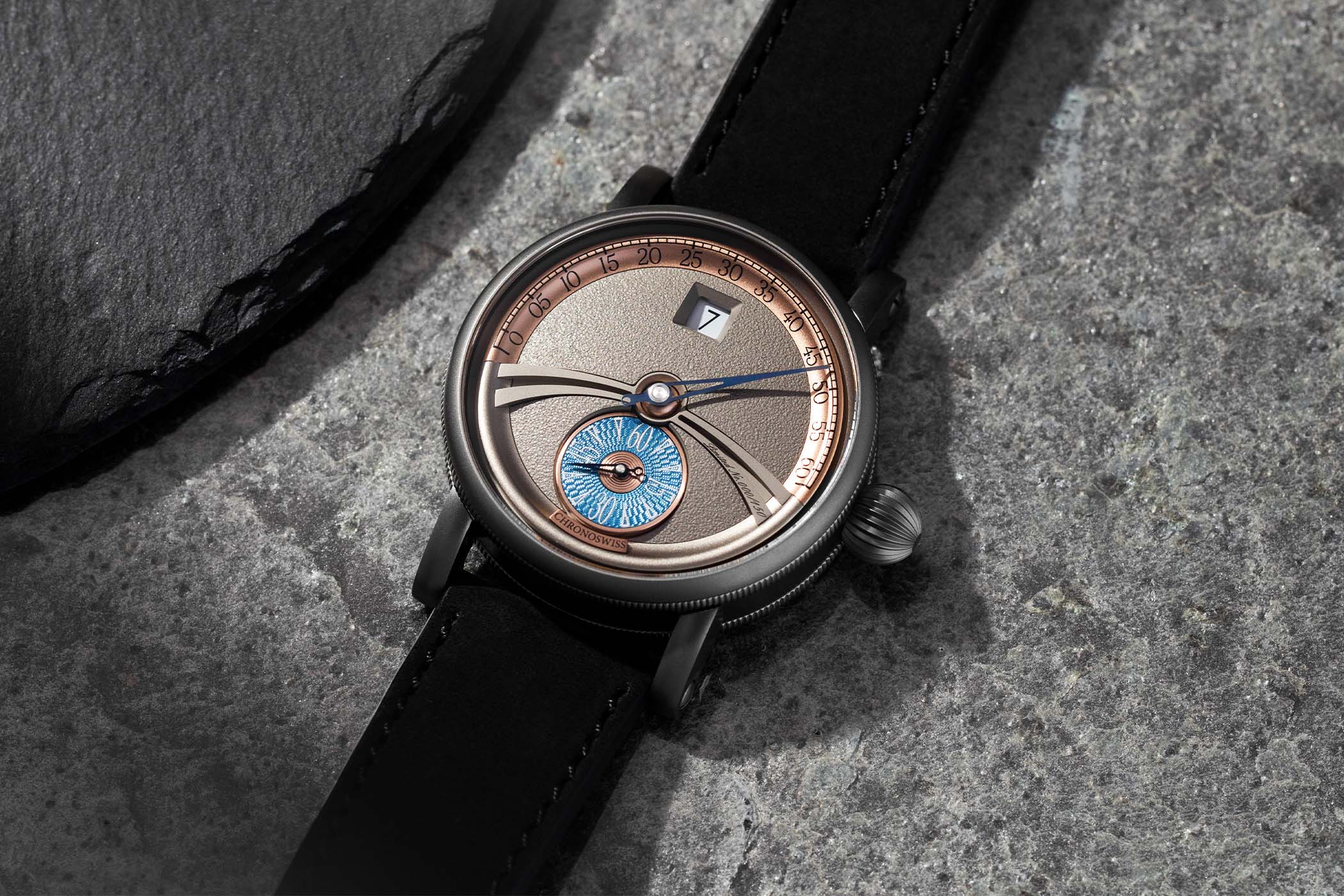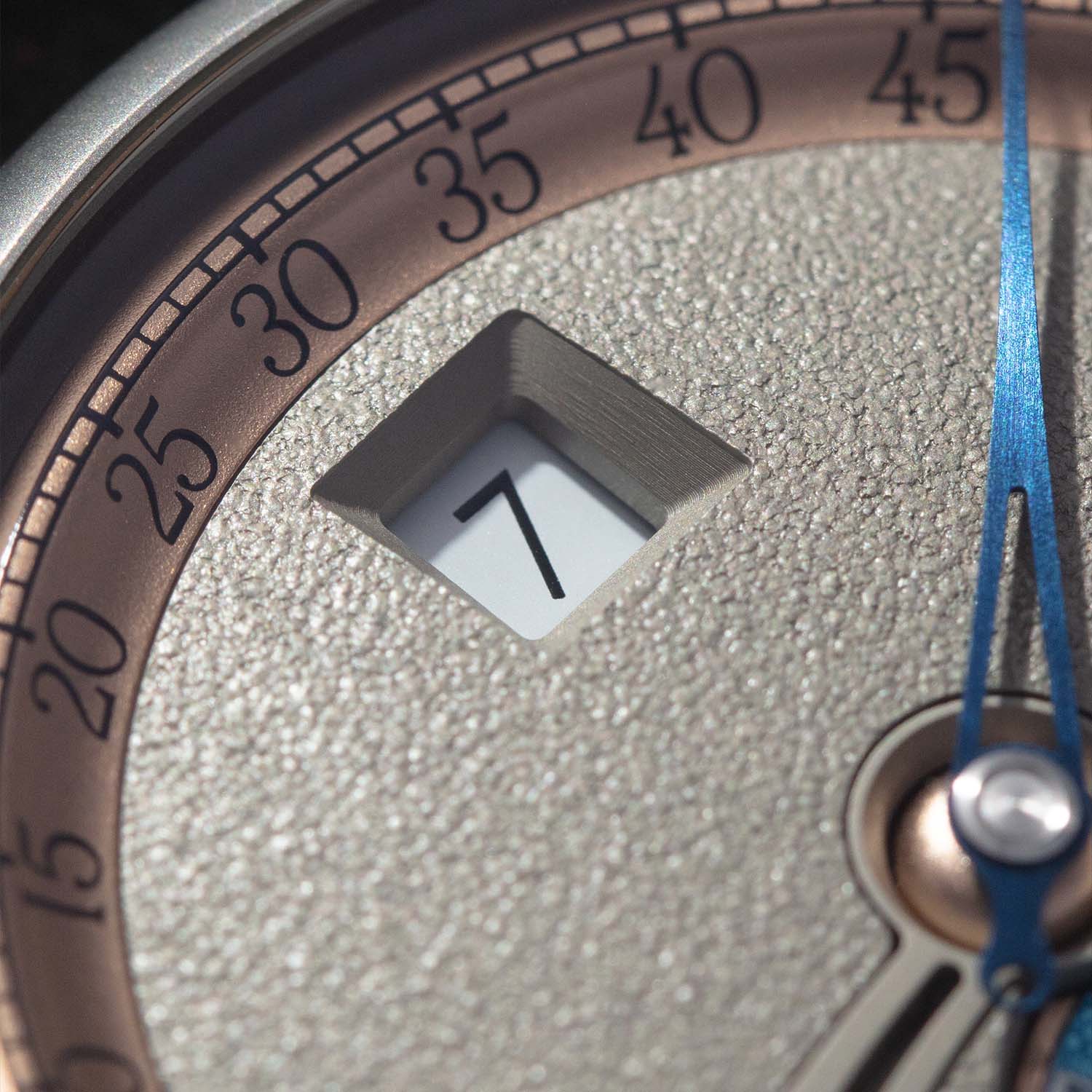 Reflecting the clean, streamlined aesthetics of the period, the dial’s surface is nickel-coated and laser-structured to create a subtle, grained texture. Picked out in an elegant soft grey tone, the deep rectangular aperture at noon, engraved into the dial, hosts the jumping hours window. Like other Delphis models, the elegant, arched, minute track is featured in the top half of the dial. The minutes are indicated by a metallic blue PVD-coated aluminium Viking-style hand, which performs a decisive retrograde jump from 60 to zero on the hour. Printed with black Art Deco-style numerals on a slim railway track, the gold-plated minutes track contrasts beautifully with the subtle grey dial.