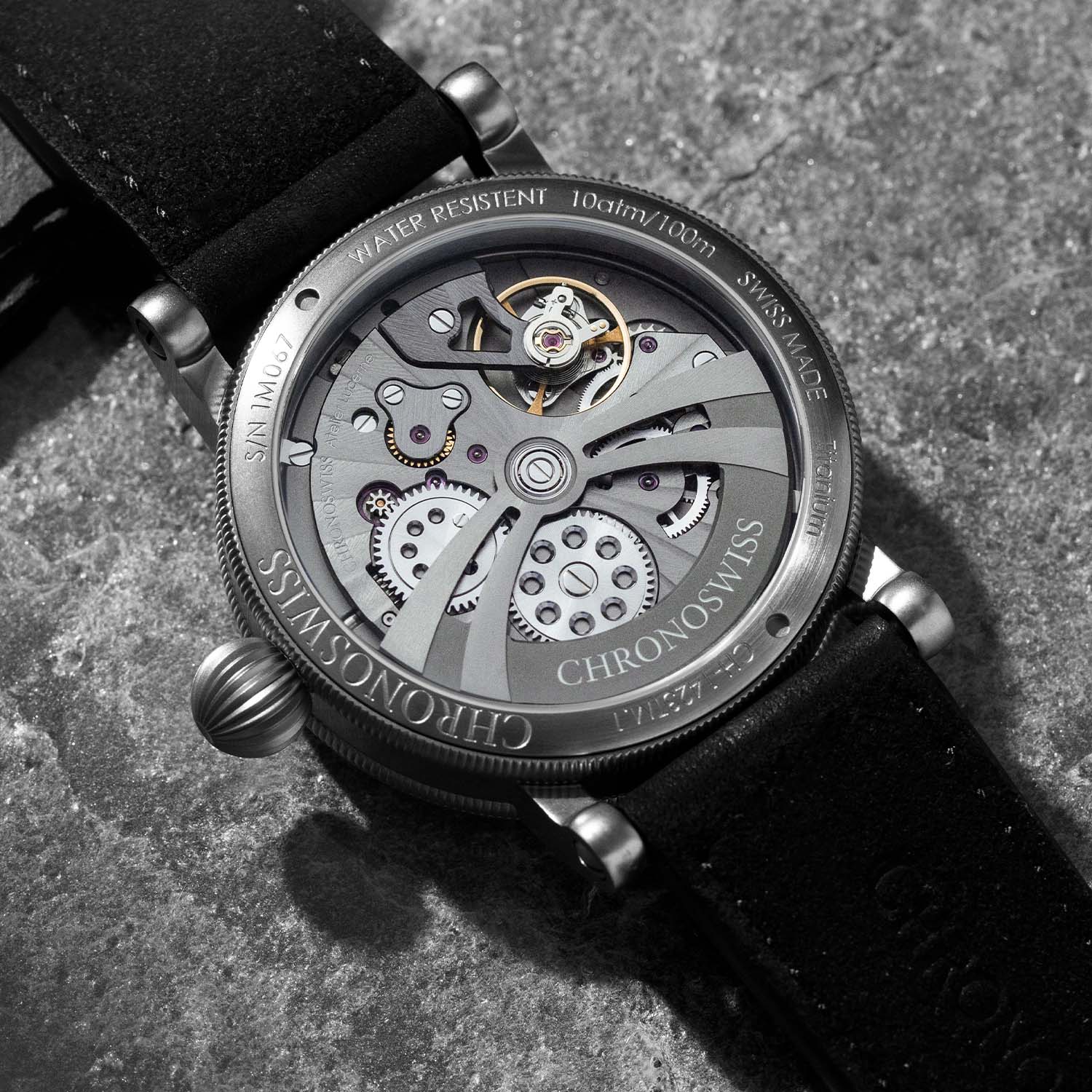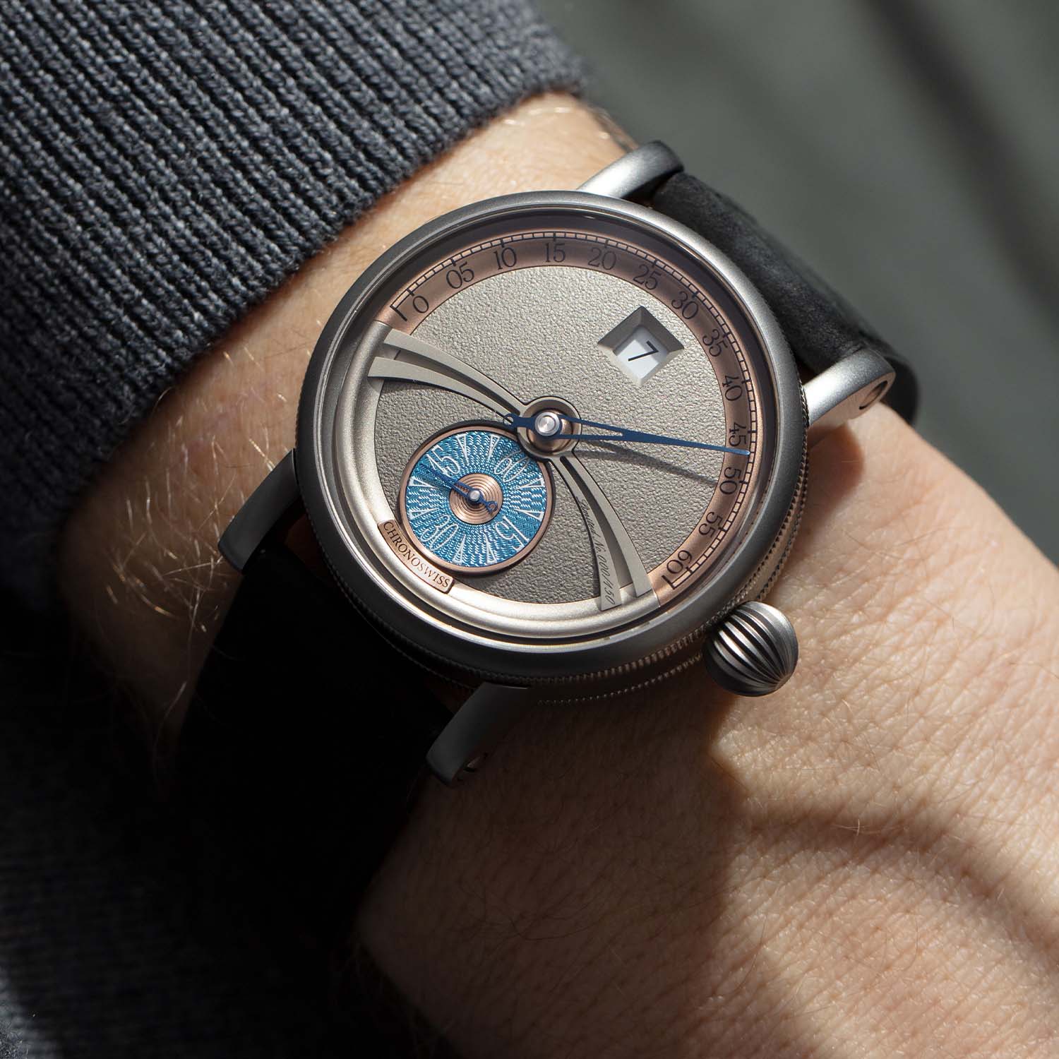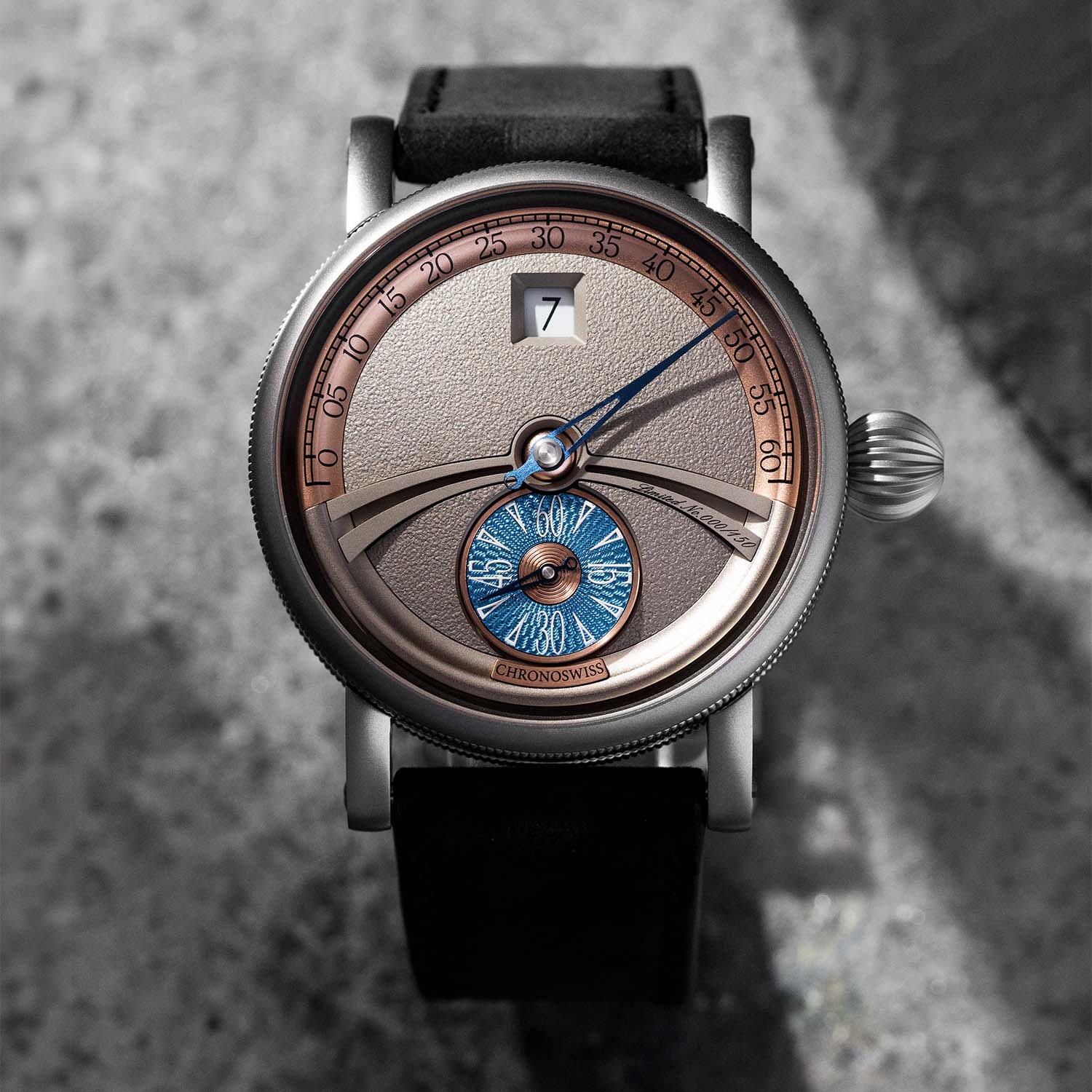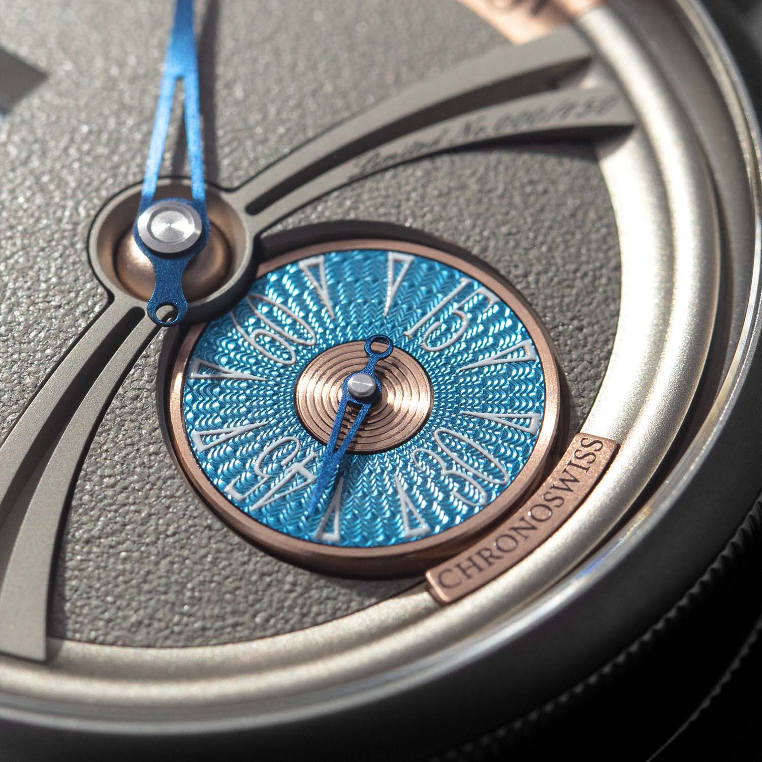 A sweeping openworked, double-arched bridge divides the dial. The small seconds counter, decorated in-house at the Atelier Lucerne using century-old guillochage machines, reveals a dynamic pattern. The attractive tone of blue lacquer applied to the hand-guilloché base is called Art Deco Blue, and its surface is printed with Art Deco-inspired white numerals and indicated by a smaller blue PVD-coated aluminium hand. The Chronoswiss plaque at 6 o’clock, the frame around the small seconds counter and the axis of the two hands share the same warm golden colour as the minutes track. An interesting feature, the small seconds counter is not flat. The base of the sub-dial is slightly elevated and protrudes from the dial, no doubt to increase the viewing angle.