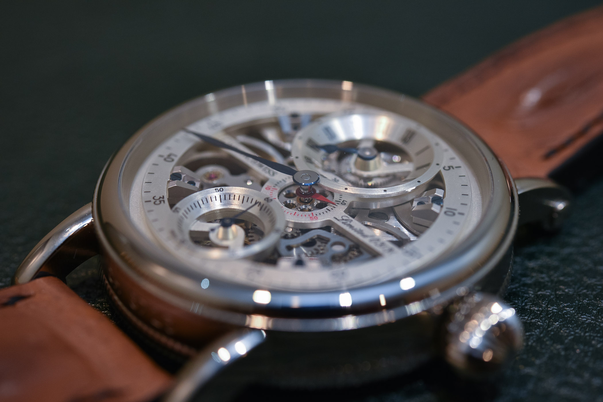 Regulator displays have a history dating back to the early 18th century. Regulator clocks adopted a non-coaxial face, which separated the time elements (hour, minute and second hands) from the more common central position. These regulator master clocks became references for adjusting newly manufactured timepieces. The minute hand was located centrally, acting as the “regulator” for watchmakers, while the other hands were pushed out of the way. The new Flying Grand Regulator Skeleton follows historical regulator set-ups with a large central minutes hand. Although it’s not uncommon to have a seconds hand in a separate sub-dial on modern watches, hour and minute hands are usually together.