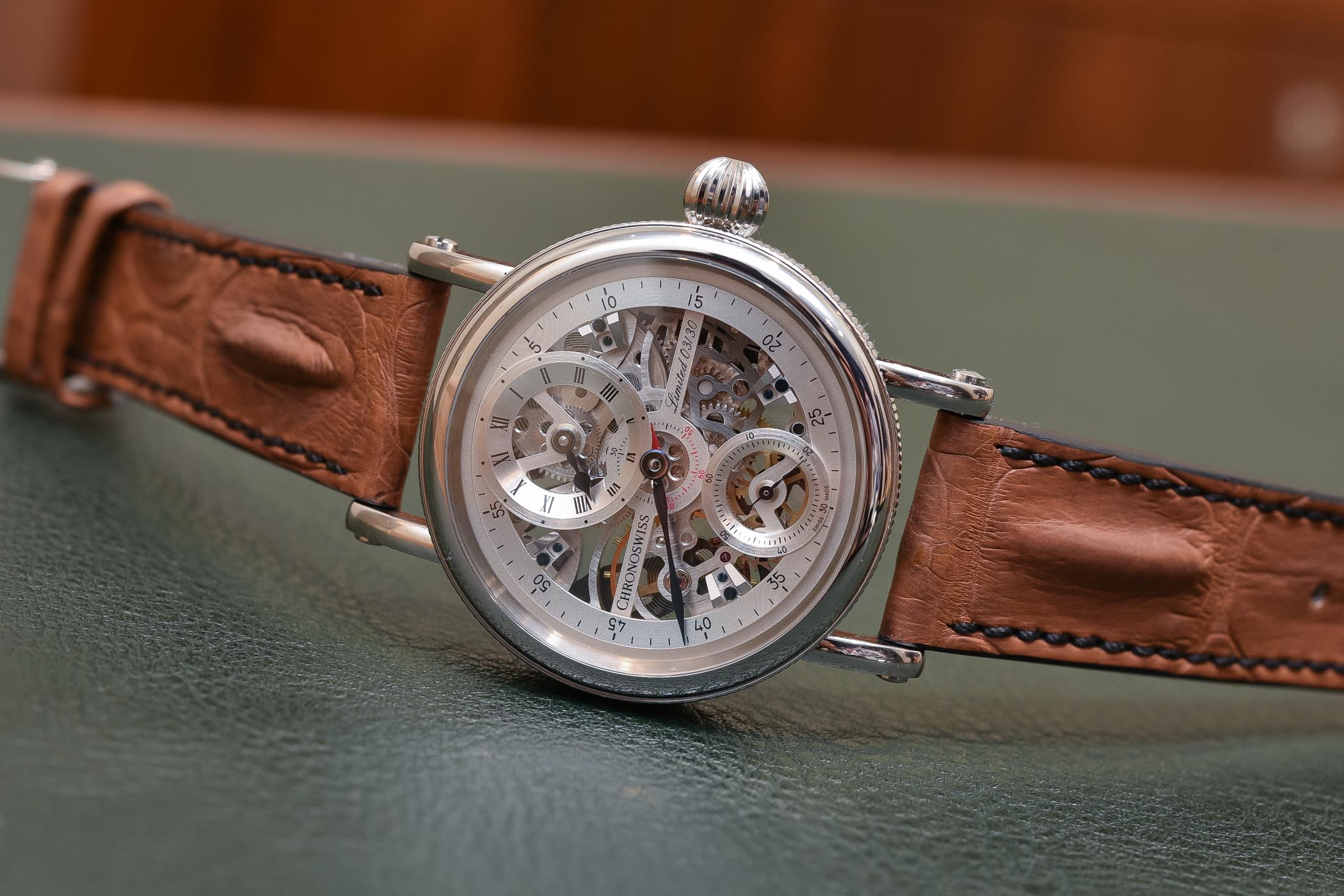 The 21-part stainless steel case is fairly large at 44mm in diameter and 12.48mm in height. It has the characteristic Chronoswiss side knurling below the bezel and around the caseback, and a large fluted onion crown. It’s unmistakably Chronoswiss. There’s a curved sapphire crystal with anti-reflective coating on the front and flat sapphire crystal on the screw-down exhibition caseback. The top of the case and bezel are polished with a brushed finish on the sides and back, and large, curving lugs attach to a brown Louisiana alligator leather strap with folding clasp. The case is water-resistant to 30m (3 ATM).