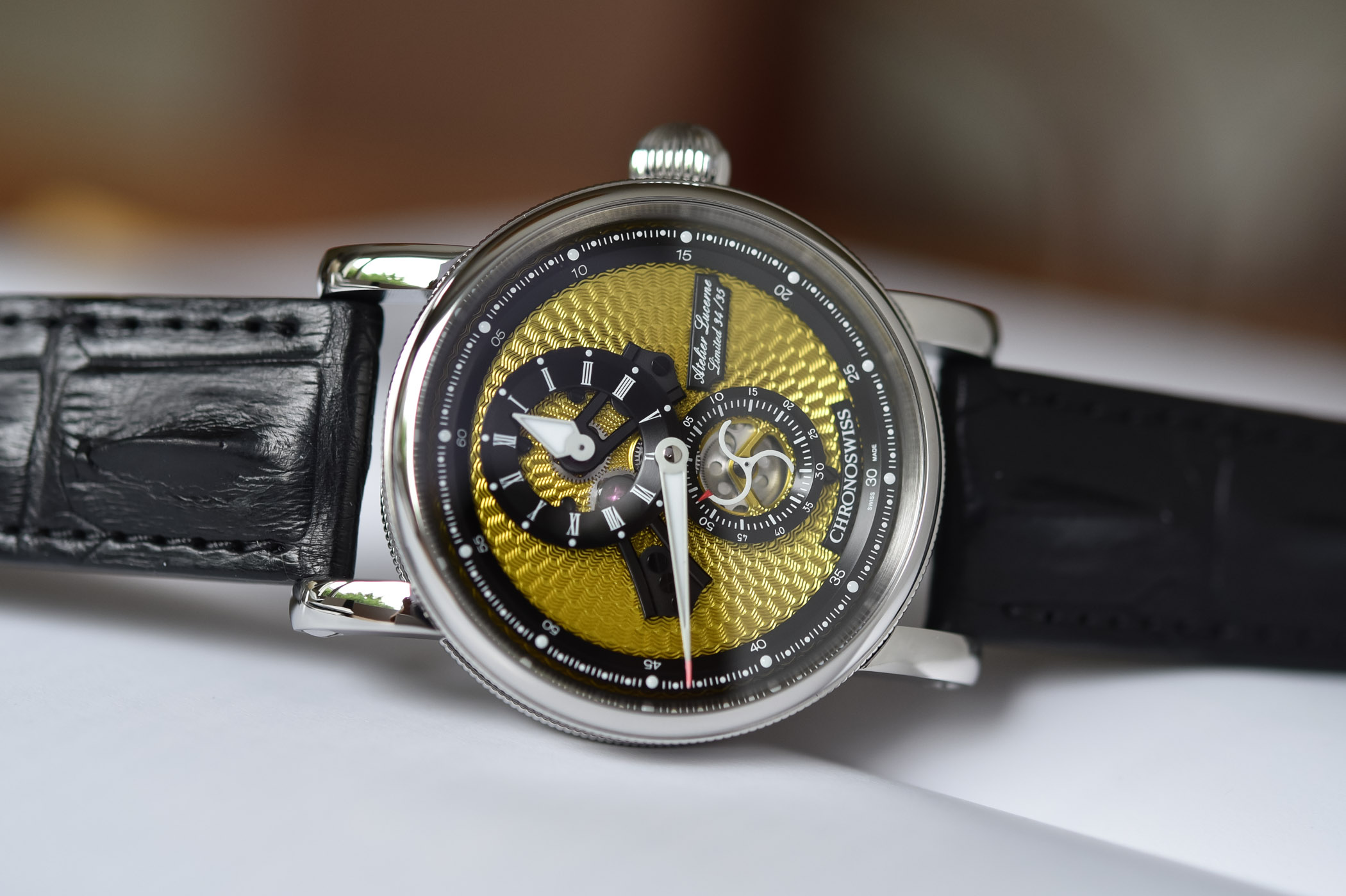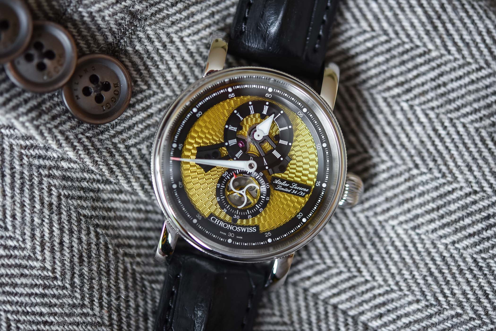 A vibrant yellow and black guilloché version of Chronoswiss’ trademark complication.