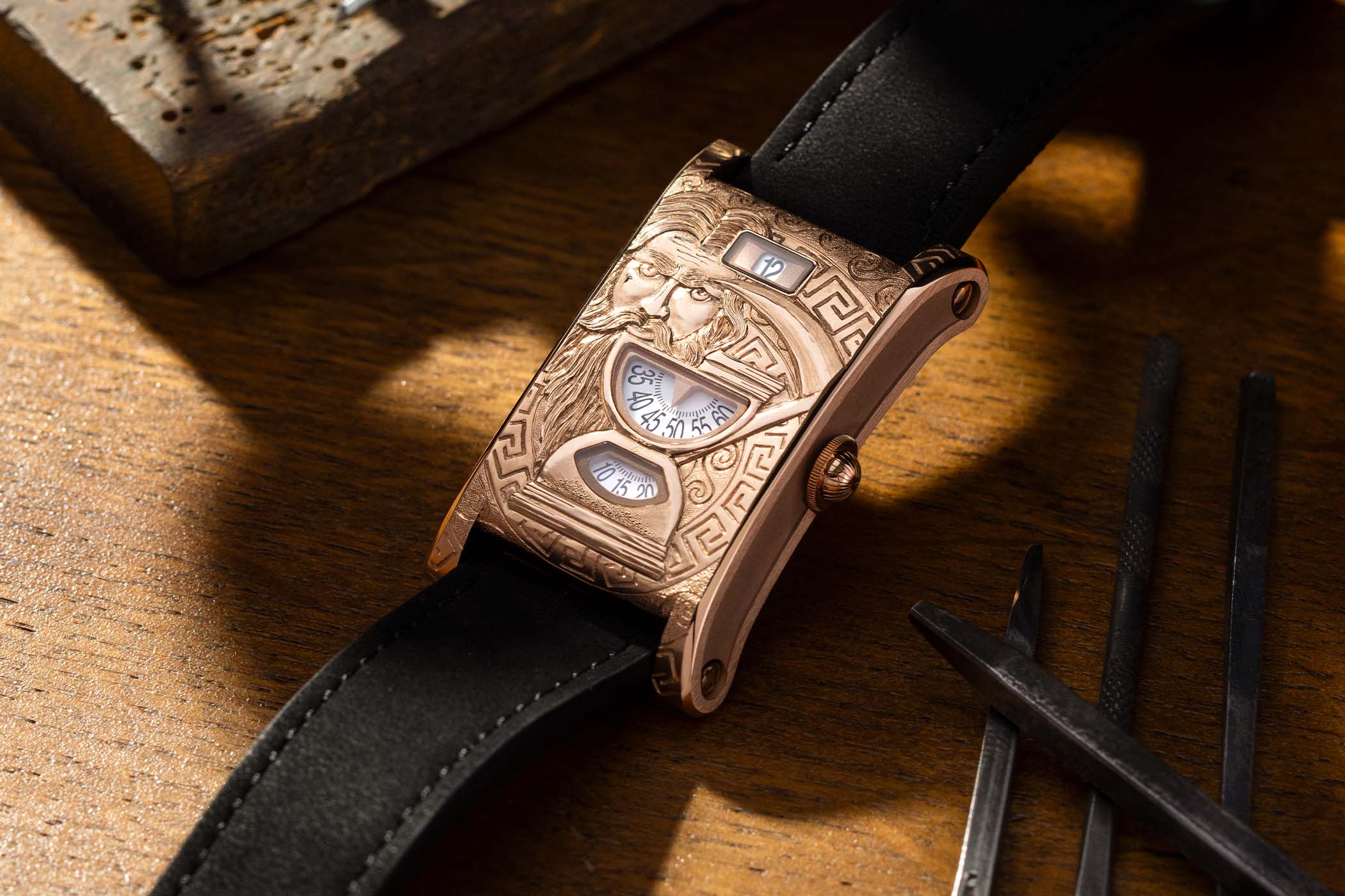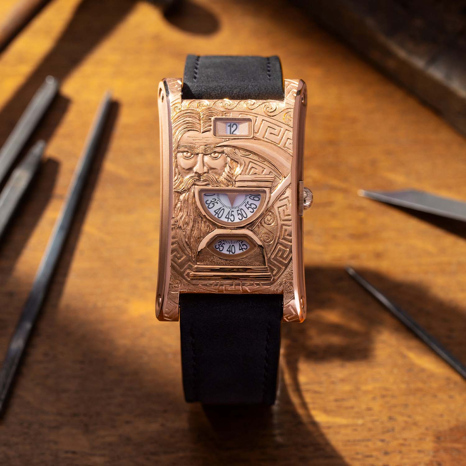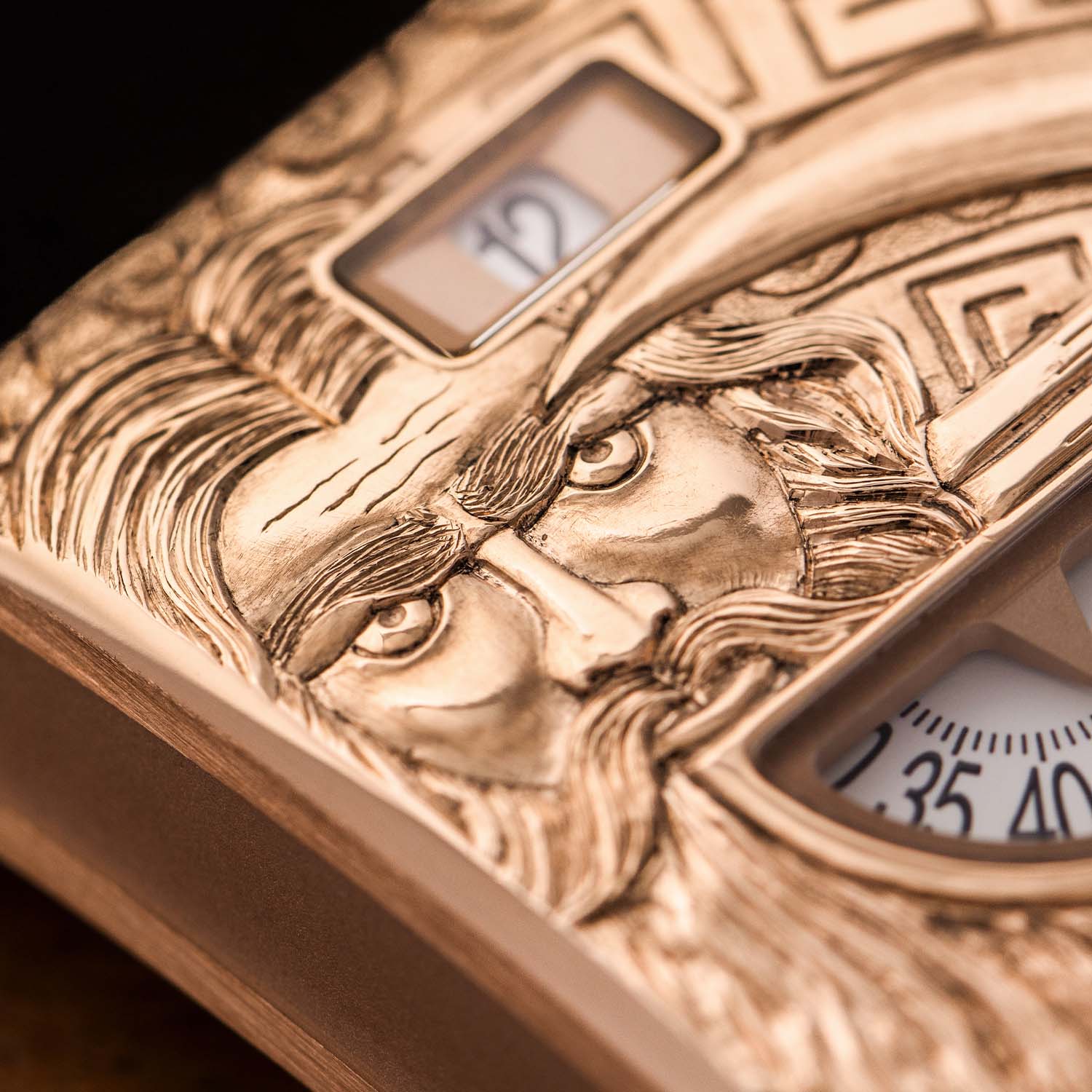 Hand-engraved in gold, the Greek god Chronos presides over Chronoswiss’ digital display of time.