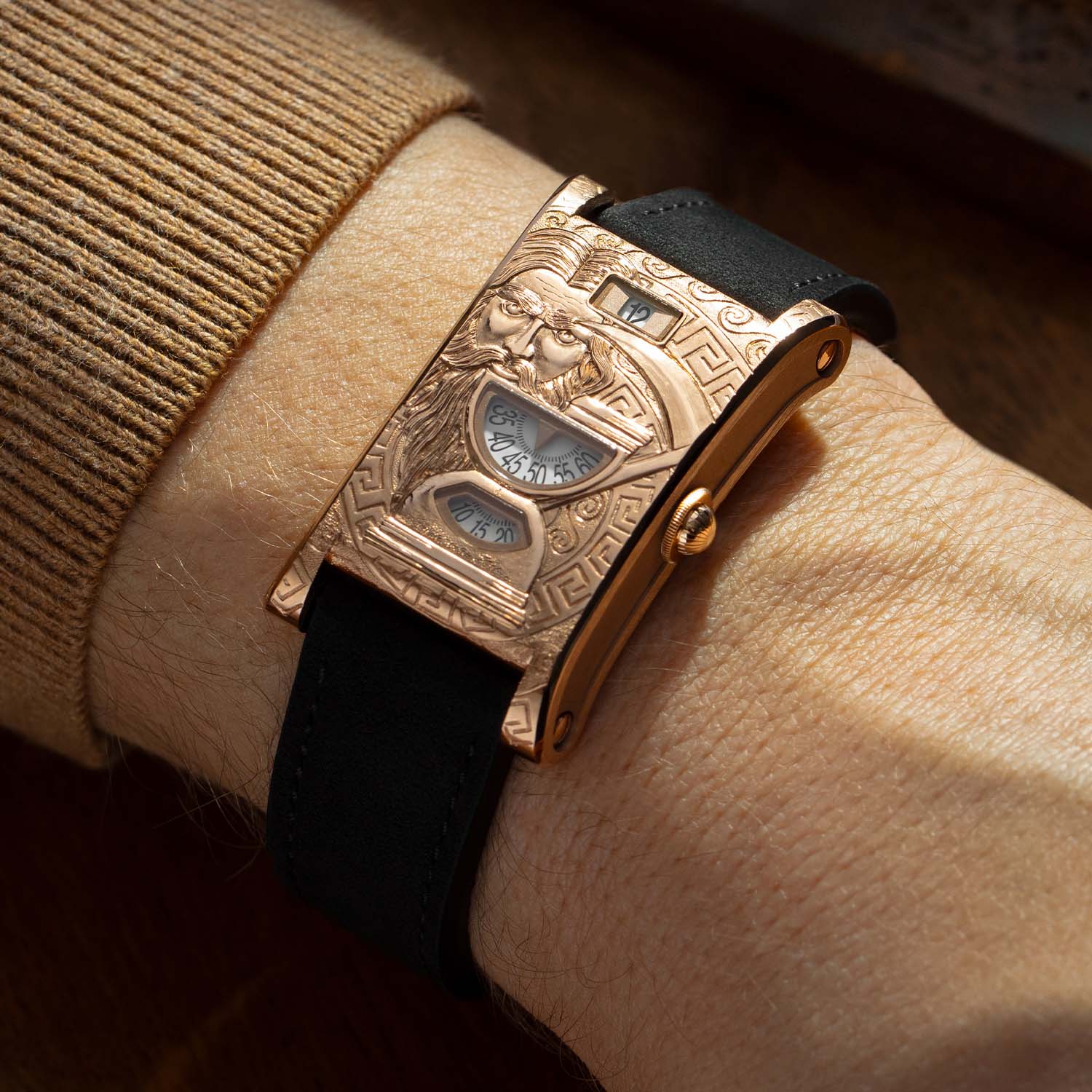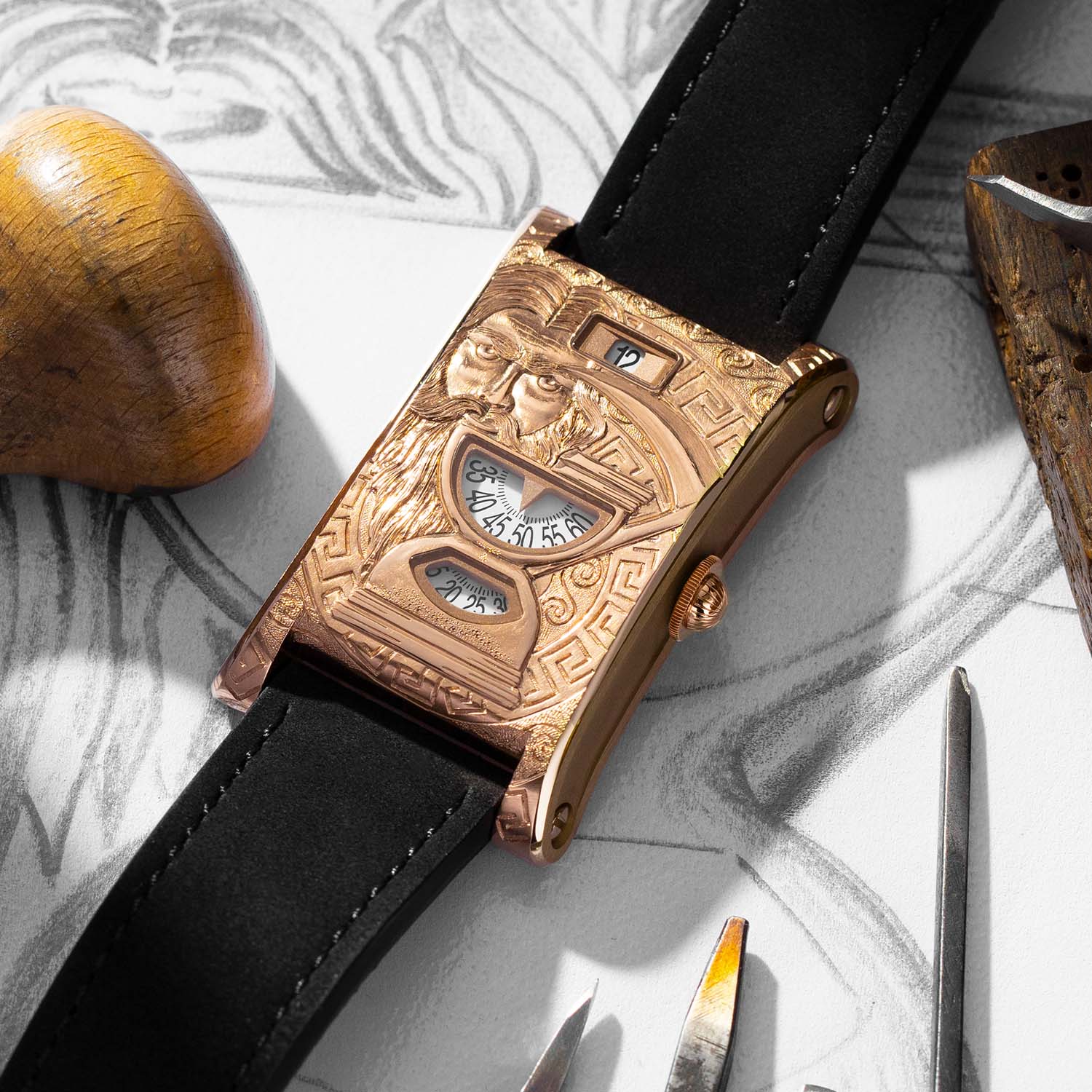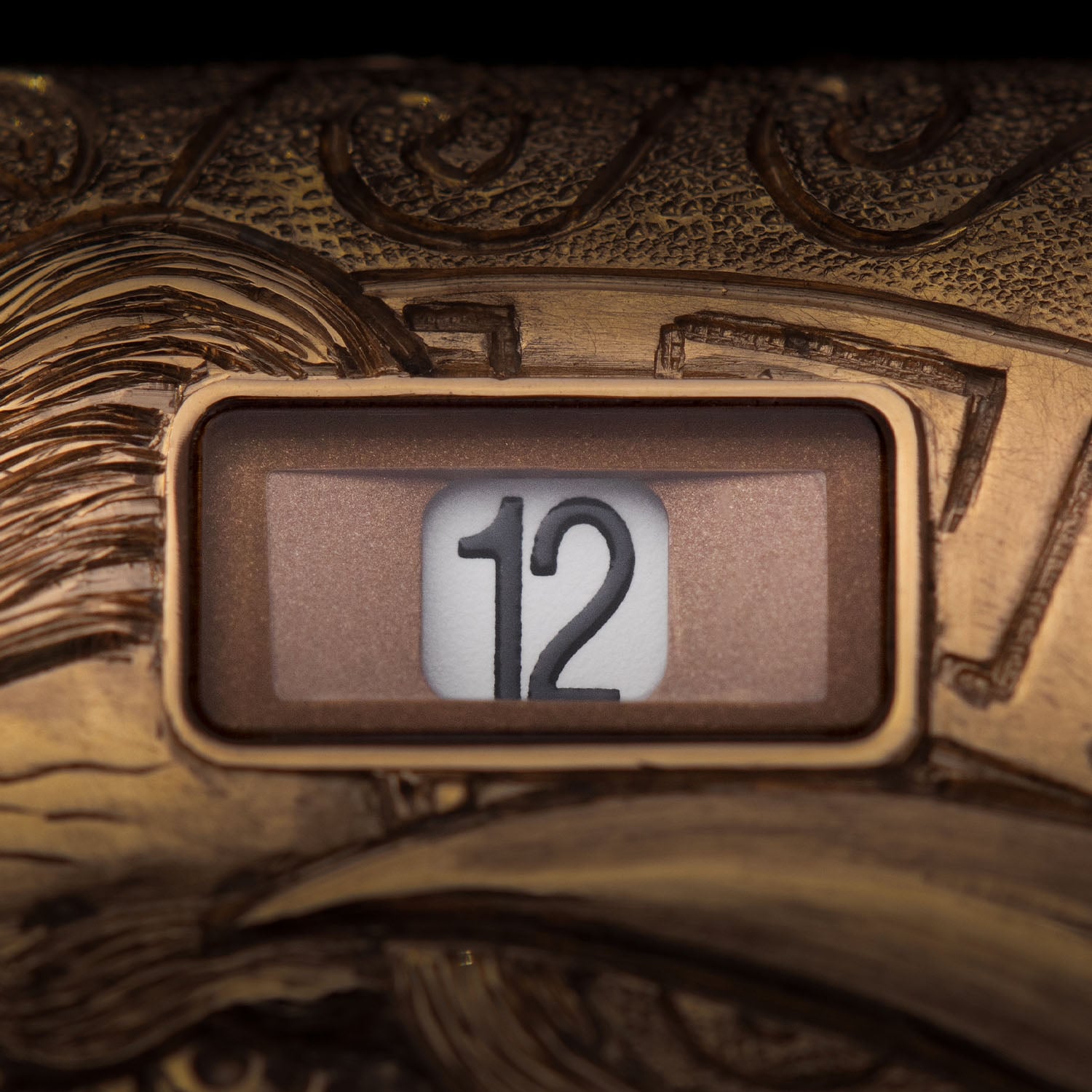 Hand-engraved in gold, the Greek god Chronos presides over Chronoswiss’ digital display of time.