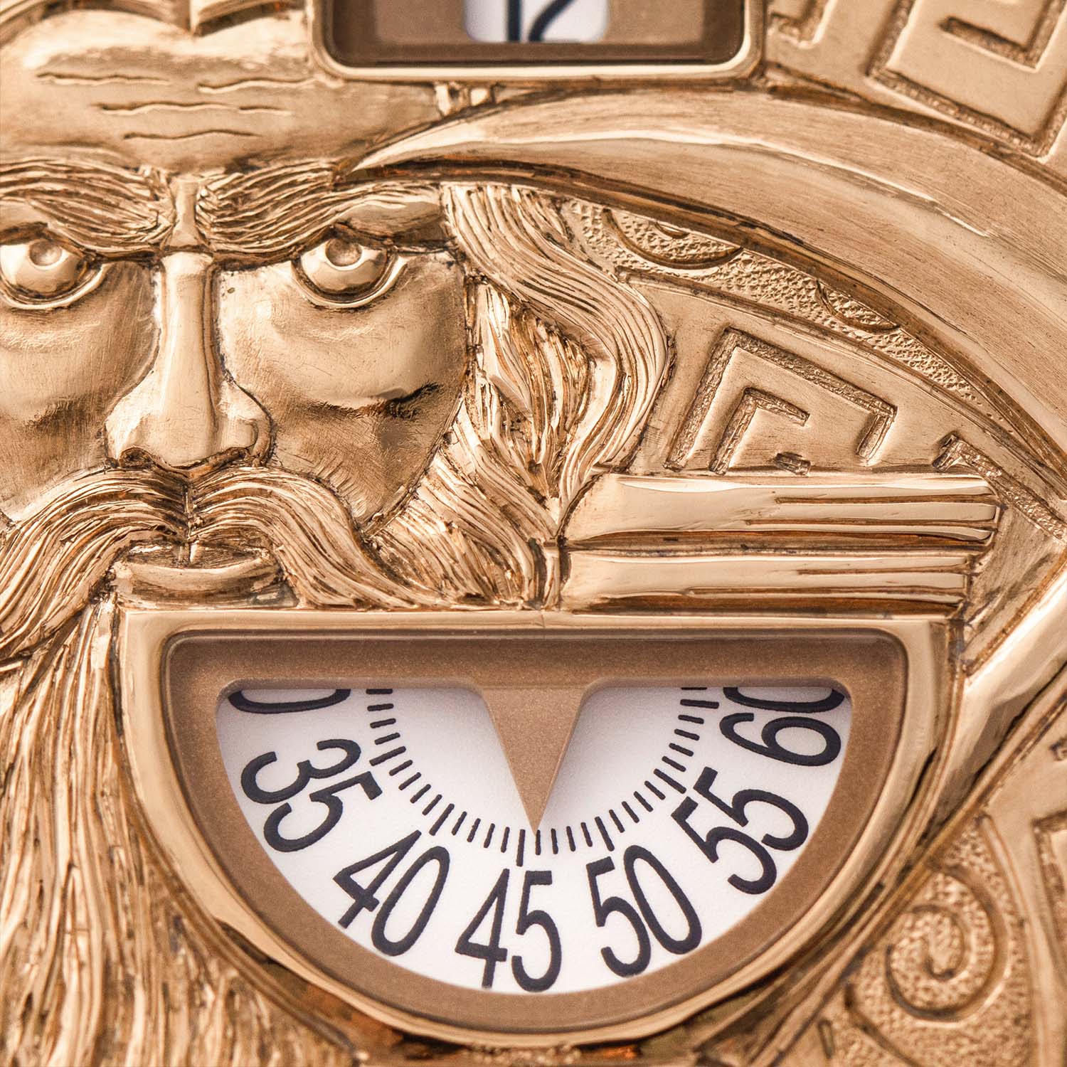 The Neo Digiteur Chronos, closer in spirit to a sculptural work of horological art, features a lavishly hand-engraved cover depicting the face of the god Chronos, surrounded by classical Greek geometric meander and wave-scroll patterns. Apart from his symbolic representation as the embodiment of time and eternity, the scythe on the right side of the dial is an unmistakable reminder of the relentless passing of time. Engraved by hand in the brand’s Lucerne atelier, no two models will ever be the same.