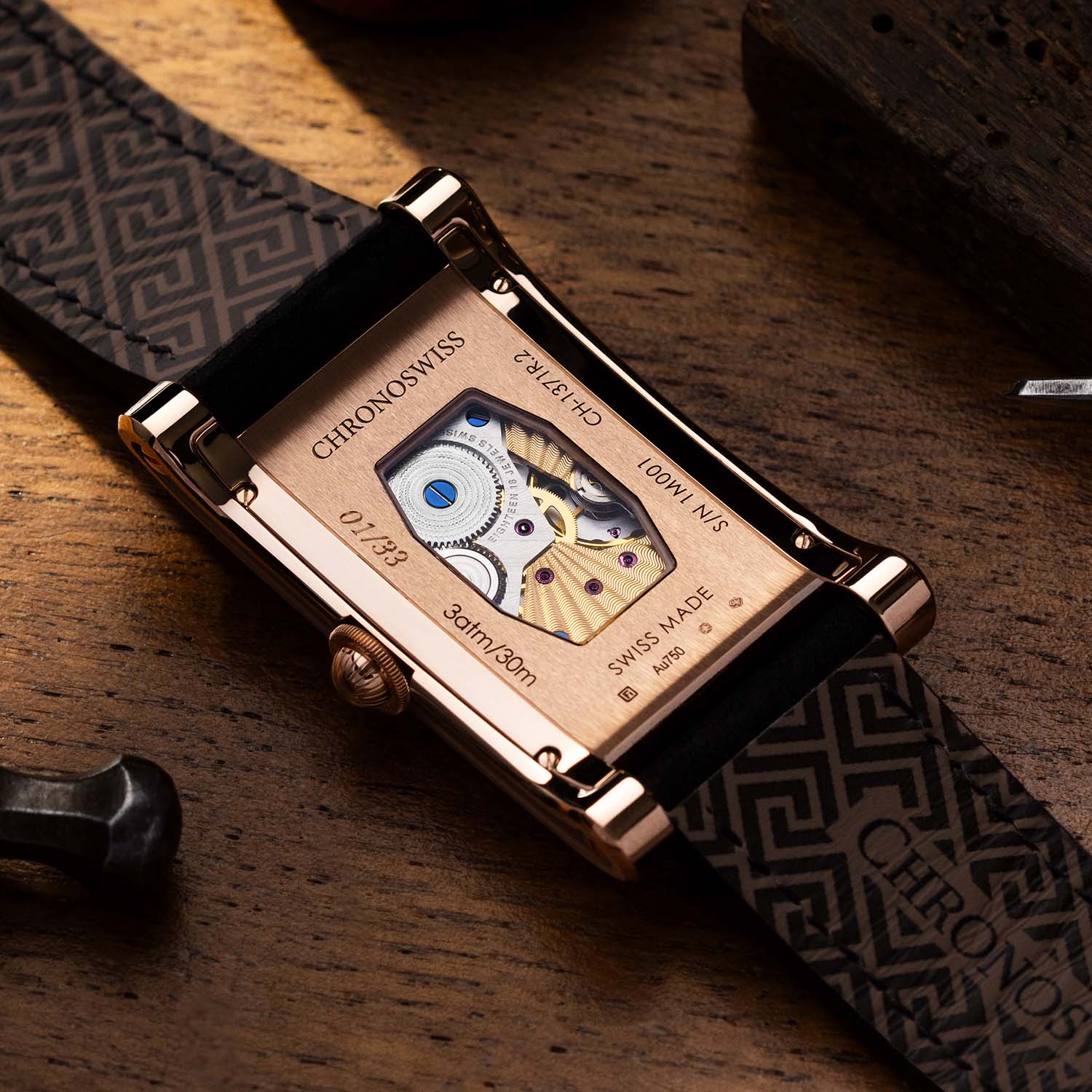 The Art Deco-inspired case, measuring 48mm in length, 30mm in width and 9mm in height, retains the same arcing rectangular shape as the steel edition but is now crafted in solid 5N gold (weight 65g). The hand-engraved gold cover reveals a variety of different finishes and is framed by a brightly polished bezel. The elegant, curved profile of the case, with recessed flanks, hosts a miniaturised, reshaped version of the signature Chronoswiss onion crown. Viewed laterally, you can appreciate the sandblasted recessed areas, the polished crown and screws and the brushed profile.