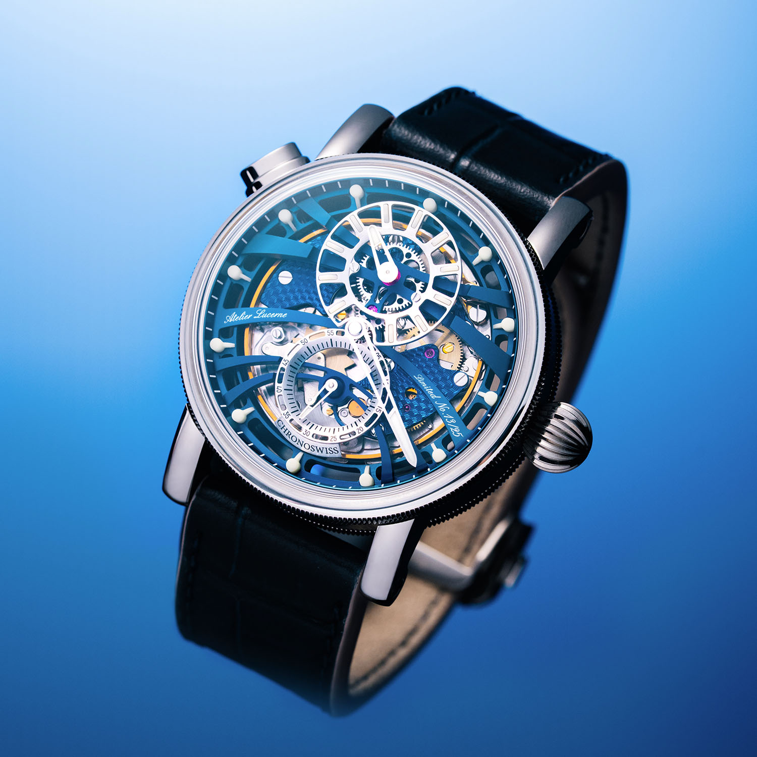 More conservative yet still contemporary, the Q-Repeater Blue Notes features navy blue CVD-coated skeletonised bridges and silver-coloured hours and seconds sub-dials. Like historical regulators, the minutes track takes precedence and is featured on the openworked galvanic blue peripheral track with 3D ceramic Super-LumiNova blocks shaped like lollipops at 5-minute intervals. The markers on the hour disc are also ceramic blocks of SLN. The two hand-guilloché bridges are blue to match the theme of the watch.