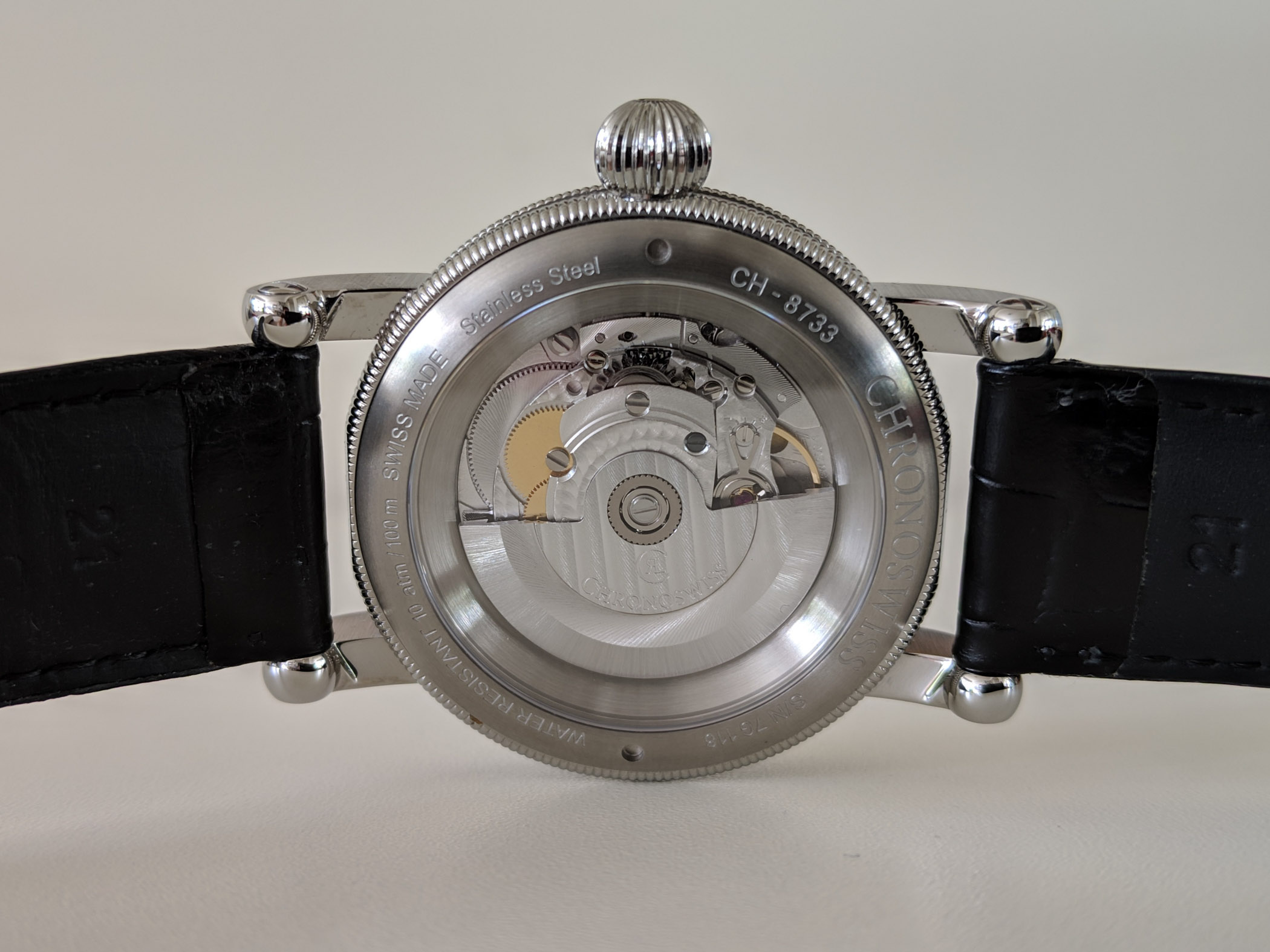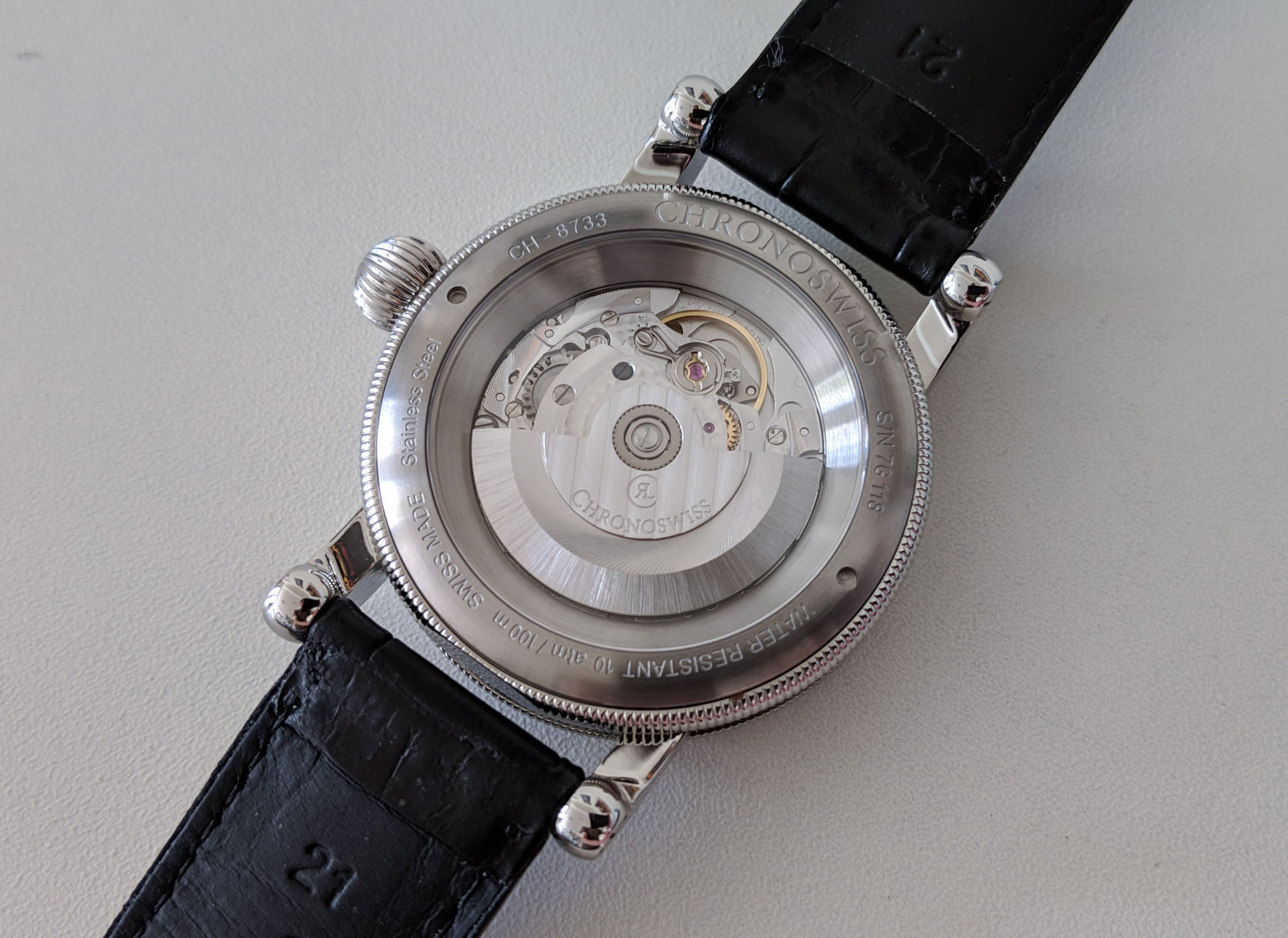A bevelled date window sits at 3 o’clock and is unobtrusive, fitting in well with the dial elements. My only complaint would be that it’s small and somewhat hard to read indoors. CHRONOSWISS tastefully curves down the left bottom edge of the dial, while REGULATOR curves up the right bottom edge. The design is deceptively complex and makes for a classy dress watch that can also fit in with a T-shirt and jeans weekend.