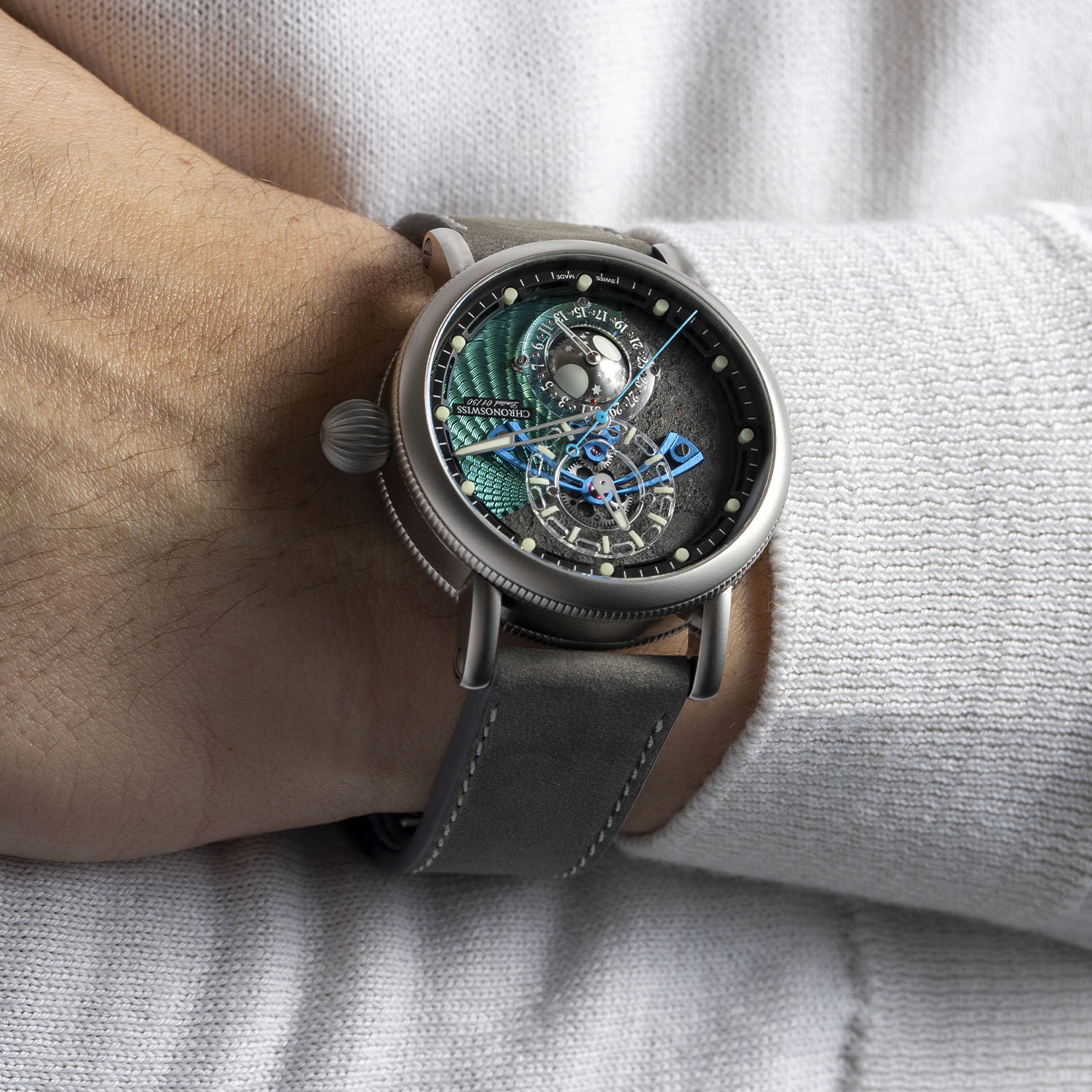 Powering the Space Timer Gravity is the automatic Chronoswiss Calibre C.308, based on the ETA 2895 with an in-house regulator module. Beating at 28,800 vibrations/hour and offering 42 hours of autonomy, it is visible through the sapphire caseback, with perlage, polished components and a skeletonised rotor.