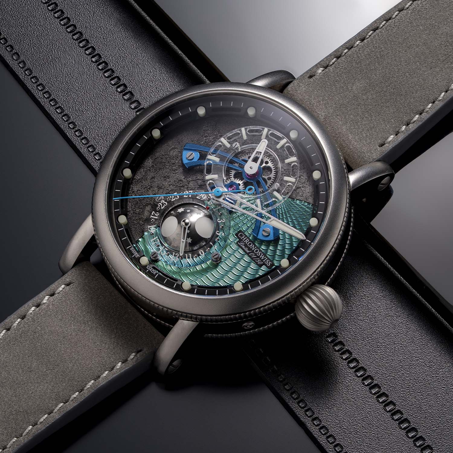 Chronoswiss’ regulator display is retained, though reinterpreted. Hours sit off-centre, closer to 12 o’clock, while the minutes and second hands are centrally mounted. Transparent ITR2 (high-end composite) rings for the hour and date indications appear to float above the dial, revealing the openworked gear train beneath. Super-LumiNova ceramic cylinders mark the hours, and the moon phase globe is inside the date subdial ring.