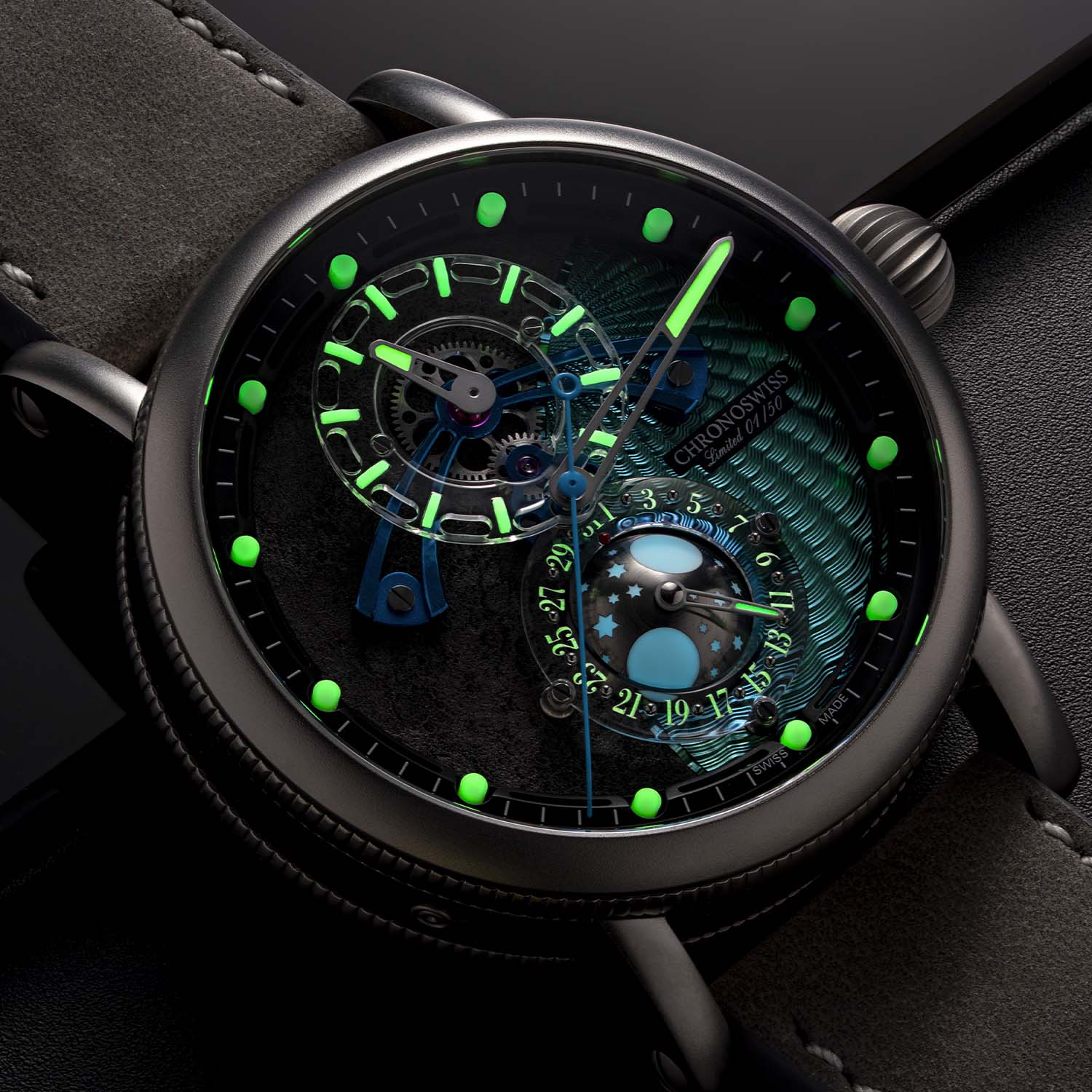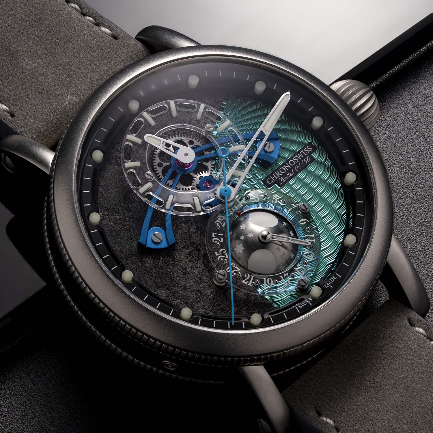 Chronoswiss’ regulator display is retained, though reinterpreted. Hours sit off-centre, closer to 12 o’clock, while the minutes and second hands are centrally mounted. Transparent ITR2 (high-end composite) rings for the hour and date indications appear to float above the dial, revealing the openworked gear train beneath. Super-LumiNova ceramic cylinders mark the hours, and the moon phase globe is inside the date subdial ring.
