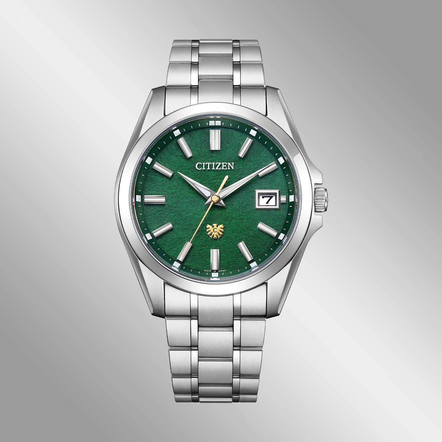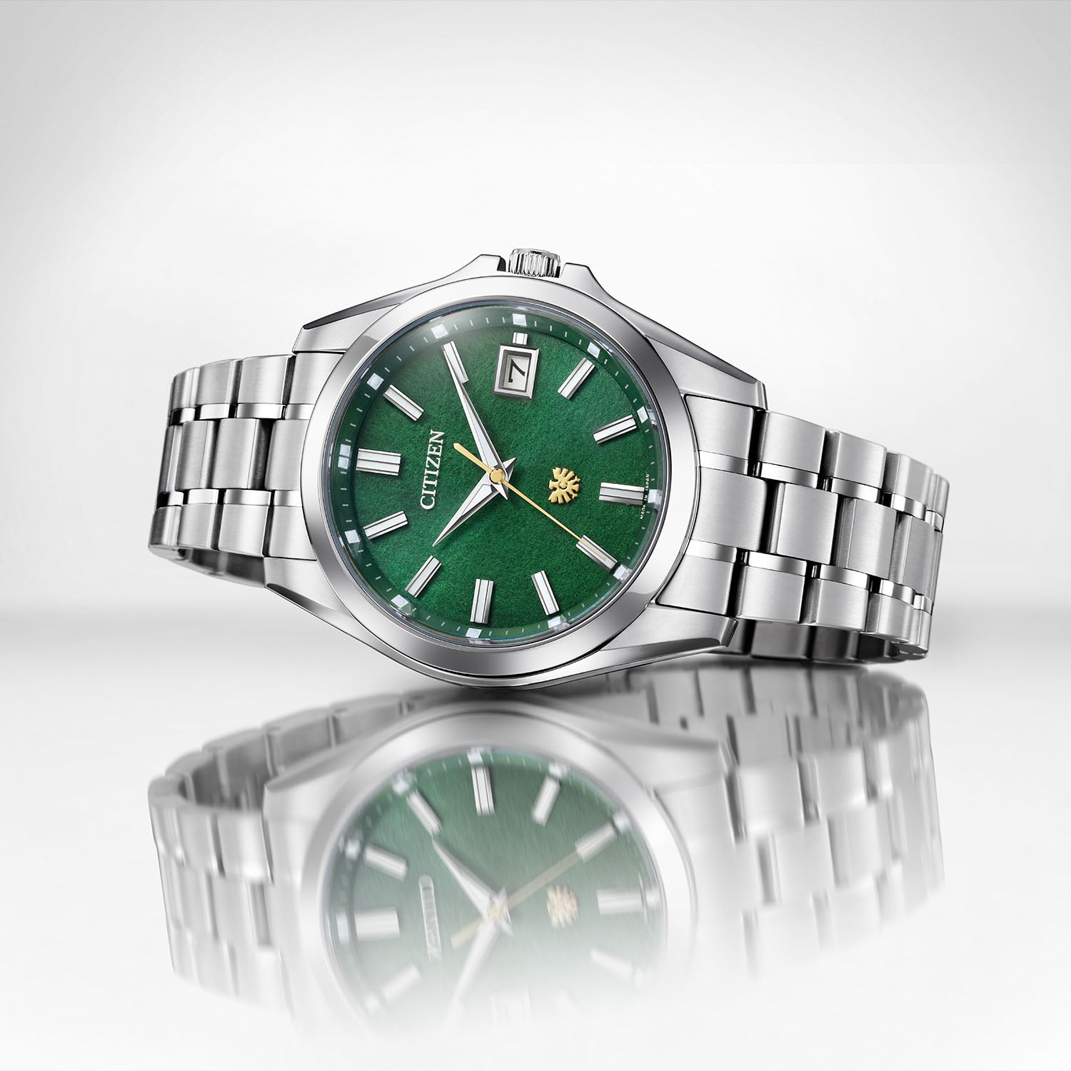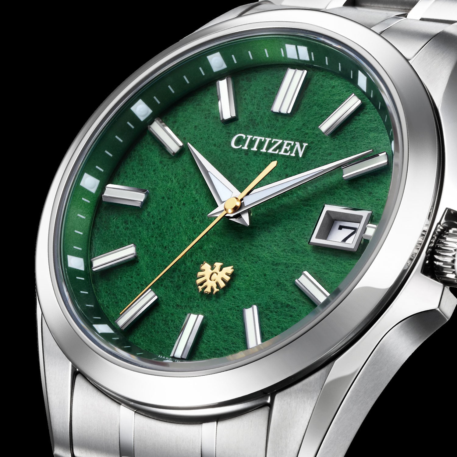 Let’s start with the dial as it’s a real standout feature on this limited-edition anniversary piece. It’s made of a Japanese paper known as washi, which is dyed in a traditional Japanese green called chitose midori. Washi is well known for use in Japanese paper lanterns and screens, and has a distinctive texture. We’ve seen washi dials before, with models like the 30th Anniversary of The Citizen flagship collection. To create the colour, a yellow ibuki kariyasu grass dye is combined with indigo, and the chitose midori green is inspired by evergreen pine needles that symbolise permanence. Contrasting with the hand-dyed dial are gold elements, starting with the applied eagle mark at 6 o’clock, which is also seen on the signed crown and case back, which is the symbol of The Citizen models. The seconds hand is also gold, while the applied indices and hour/minute hands are silver with Citizen’s Natulite lume.