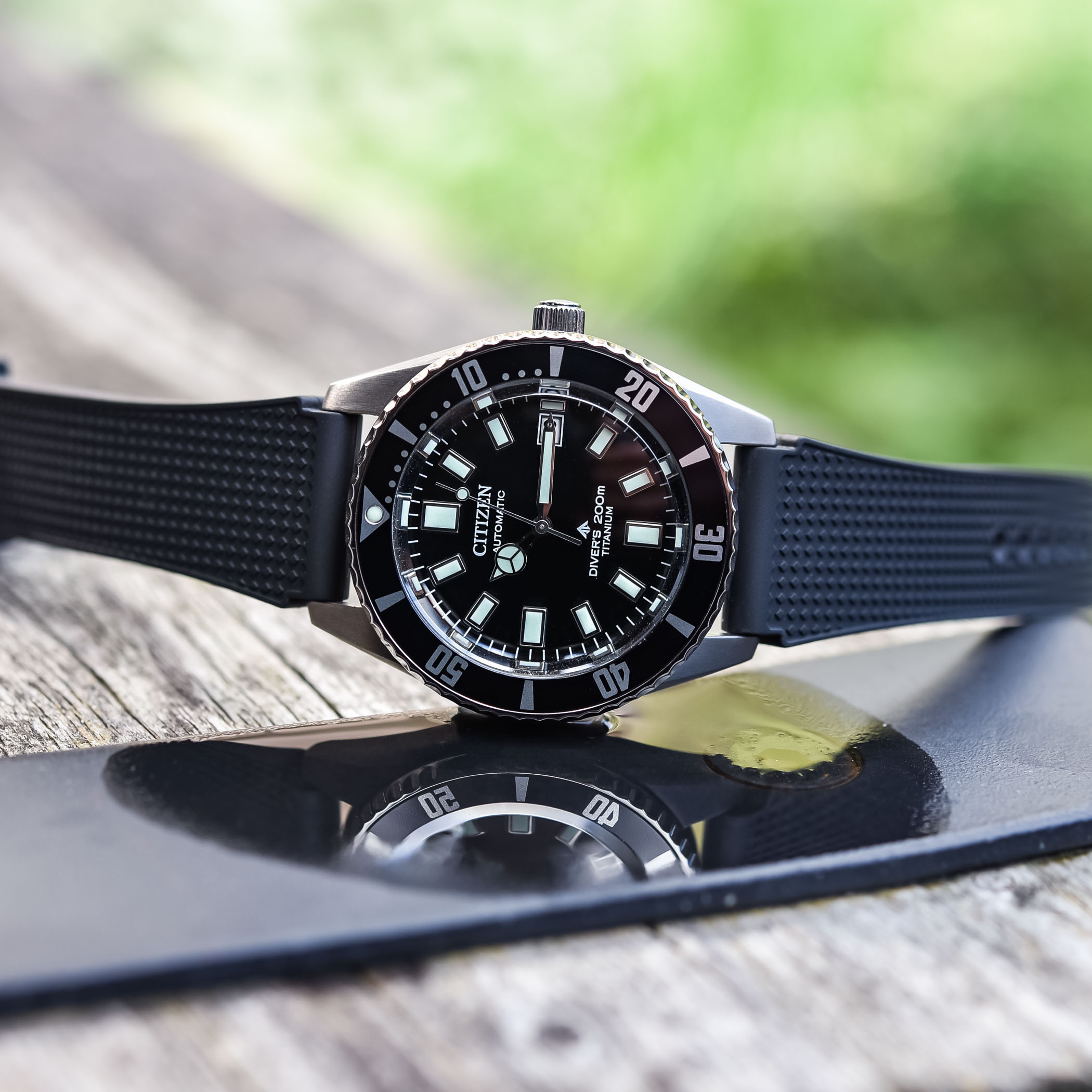 Citizen offers two variations of the Promaster Fujitsubo. One in titanium and black (reference NB6021-17E), worn on a black polyurethane strap with a titanium pin buckle. And the other with a deep blue dial and bezel (reference NB6021-68L), and a three-link Super-Titanium bracelet with a folding clasp. While we only had the black version in hour hands, we believe both will feel great on the wrist. The fit and finish are very good, and thanks to the lightweight titanium construction it doesn’t weigh you down one bit. It retails for about EUR 650 in black and polyurethane strap, and about EUR 750 in blue and titanium bracelet.