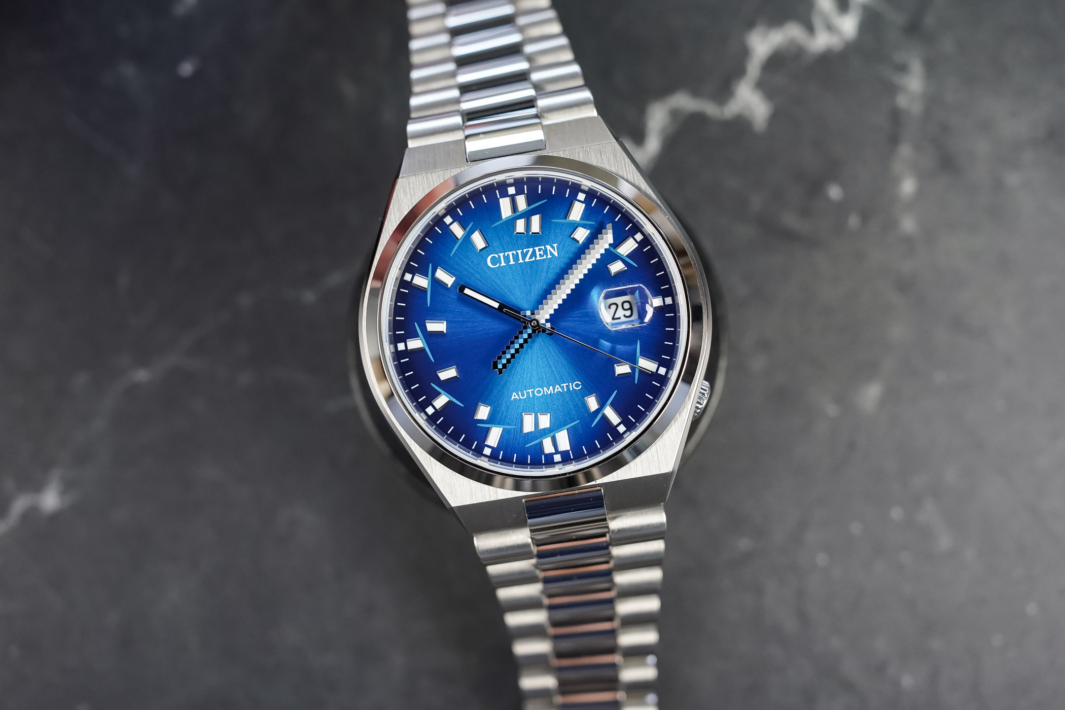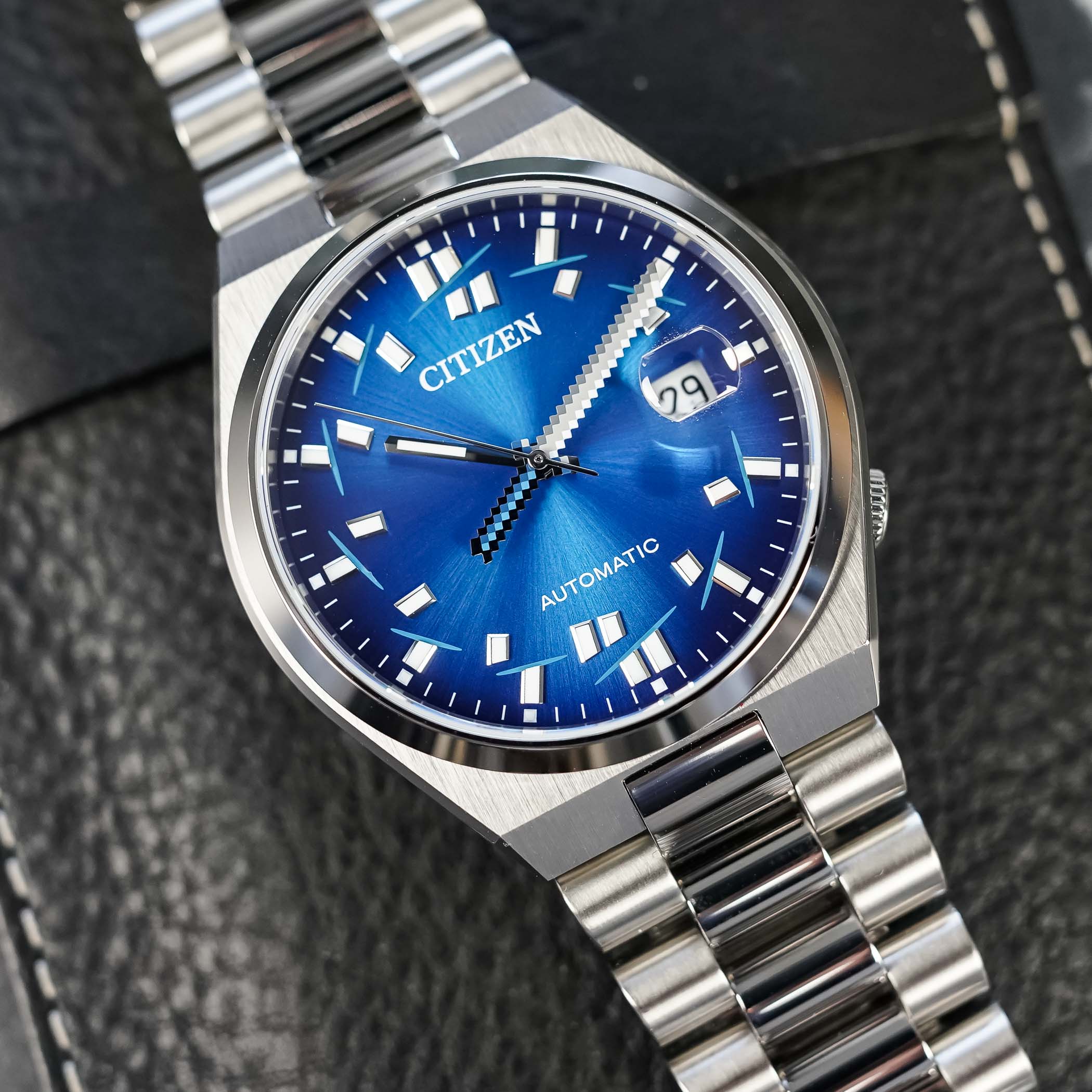 Externally, no major evolutions to be noted. This collaboration model is based on the classic 40mm Tsuyosa, with a stainless steel case alternating between polished accents and brushed surfaces. What was good about the standard versions remains – an overall pleasant quality for the price, a sapphire crystal with magnifier over the date, a reasonable lug-to-lug measurement – and what’s a bit more debatable also stays – a 50m water-resistance that could be improved, a crown at 4 o’clock that might be a bit too recessed, a thickness of 11.7mm that we’d love to see below 10mm. But then again, in this price range, no one really does better than Citizen.