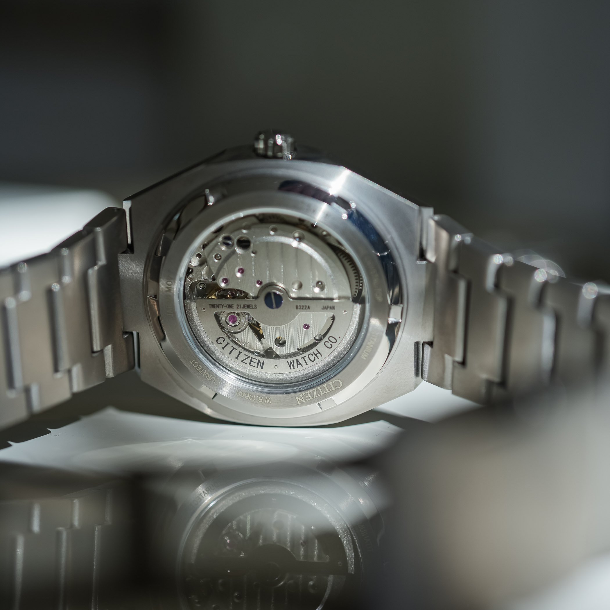 Flip the watch over, and the display caseback exhibits the automatic Calibre 8322, a recent evolution of Citizen’s in-house mechanical line. This movement replaces the 8213 found in last year’s model, and the improvements are meaningful.