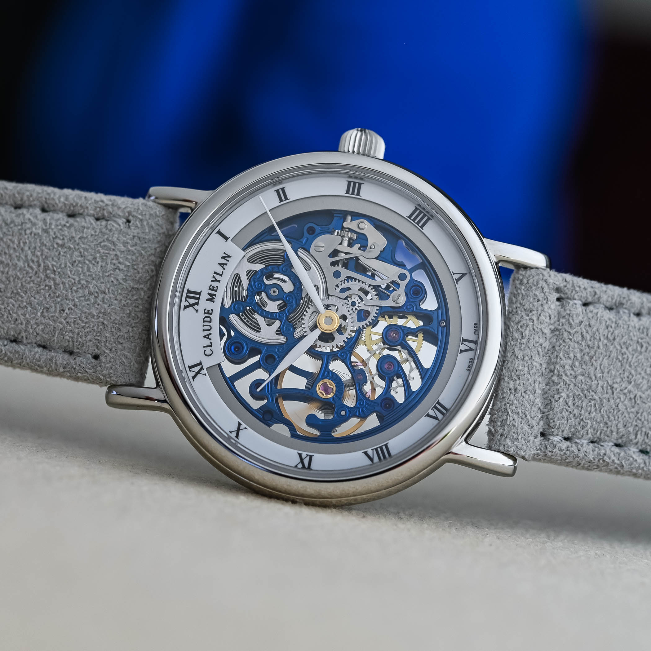Skeletonized hand-wound movements in pastel colours for a touch of modern elegance.