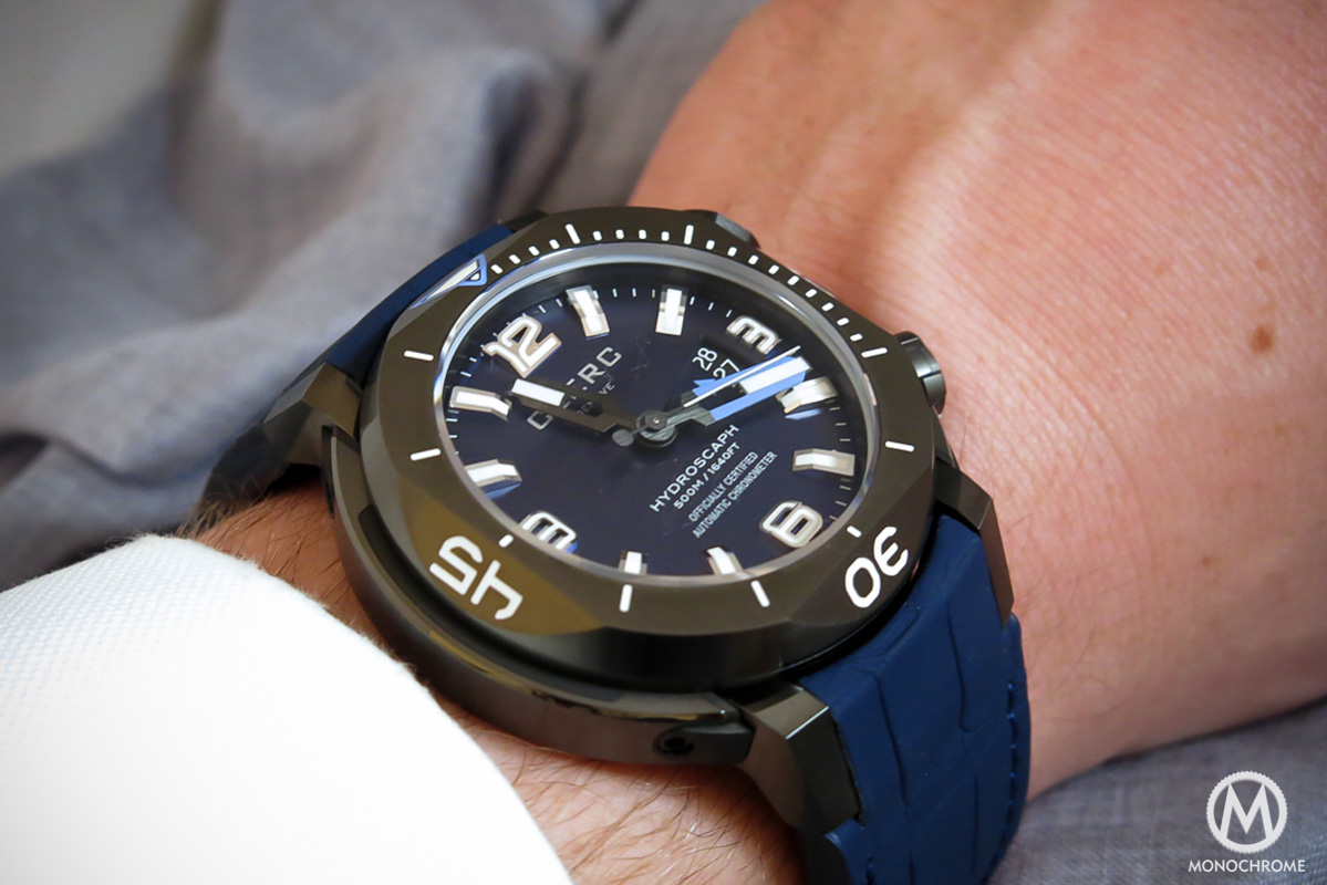 For the Hydroscaph H1s, the fold-out bezel crank is on the right, and for the Chronographs, it is relocated away from the pushers on the left. This mechanical setting and external locking of the bezel removes any issues with grip or accidental default when using the bezel, adding yet another level of refinement to the watch’s function.