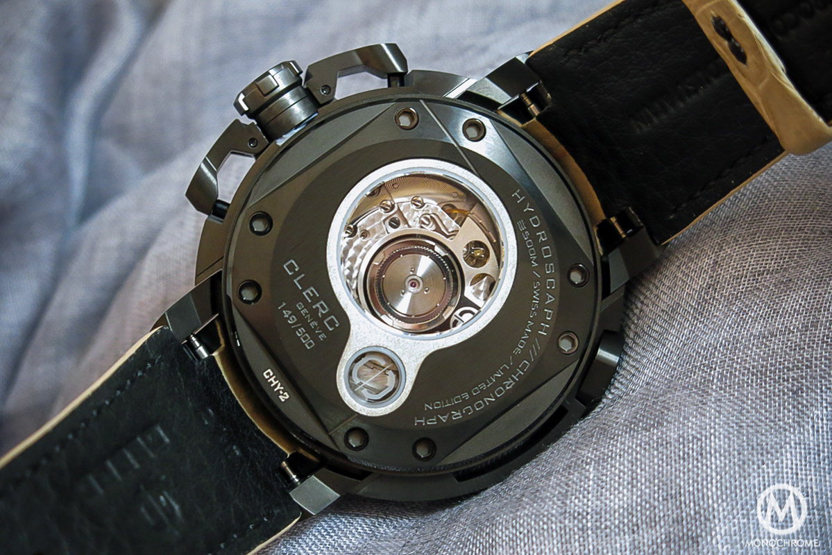 In addition, luxury and power are united in Hydroscaph H1 and Chronograph high-density steel cases. The safest bet when constructing a rugged dive watch is to offer a solid caseback, but Clerc provides two portholes on its hind side, a larger and a smaller. These windows have the necessary crystal thickness for the depths and create a submarine viewing experience. The off-center larger window clearly shows the balance wheel and flashes of the circularly vented rotor when it pivots; the smaller window shows flashes of the rotor’s edge. The Clerc Hydroscaph have a water resistance rating of 500 meters and mobile lugs to ensure a secure fit and comfort over a dive suit. Each case, surrounded by its own peripheral case guard construction, is ready for anything.