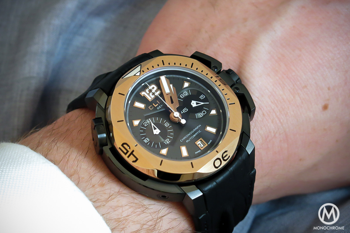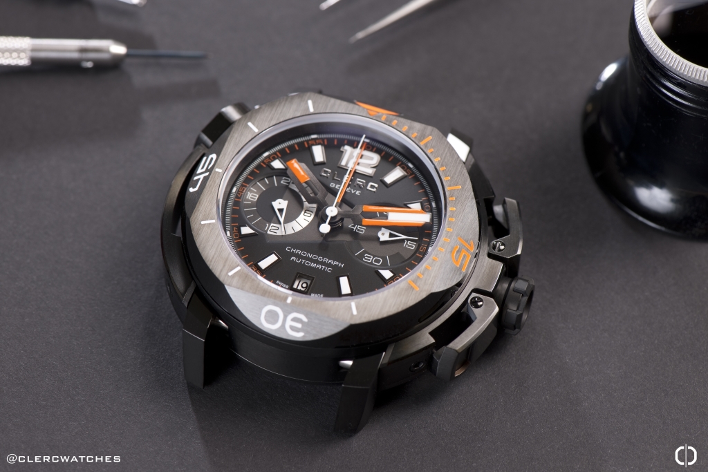 Most watch enthusiasts can identify a dive watch at a glance even if the watch only emerges from under a cuff for a few seconds. The bezel is the typical giveaway, but a watch’s brand may be more readily recognizable: the name, DNA and ubiquitous presence. Leave it to Clerc to differentiate themselves by putting a square peg into a round hole, a design reference to the Hydroscaph’s inimitable bezel (a topic for further elaboration), and construct a high-end, hand-crafted, low-production dive watch. Two offerings position the brand, the three-hander Clerc Hydroscaph H1 and the Clerc Hydroscaph Chronograph Limited Edition (the later we explored here). Becoming acquainted with Clerc clarifies what sets a Hydroscaph apart from the crowd.
