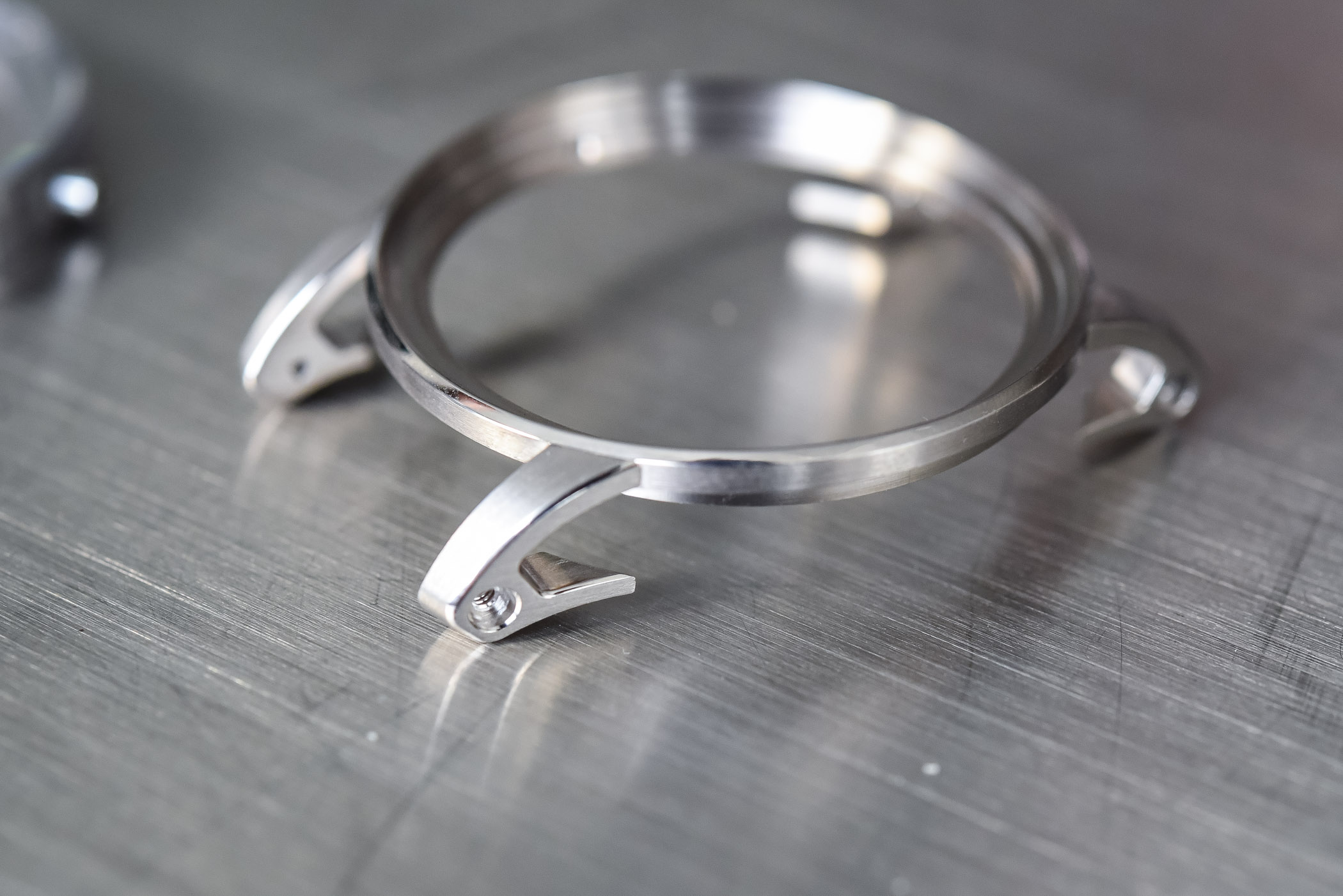 The same dual nature can be applied to the lugs. From the top, they appear simple. However, these lugs, an integral part of an element that also incorporates the bezel, are hollowed, finished with a brushed surface and complex polished bevels. Funny detail is that the screw heads are hexagonal, simply for visual pleasure, which is again another nod to the hexagonal screws on the Royal Oak. Looking at these details offers a truly different perception of the case.