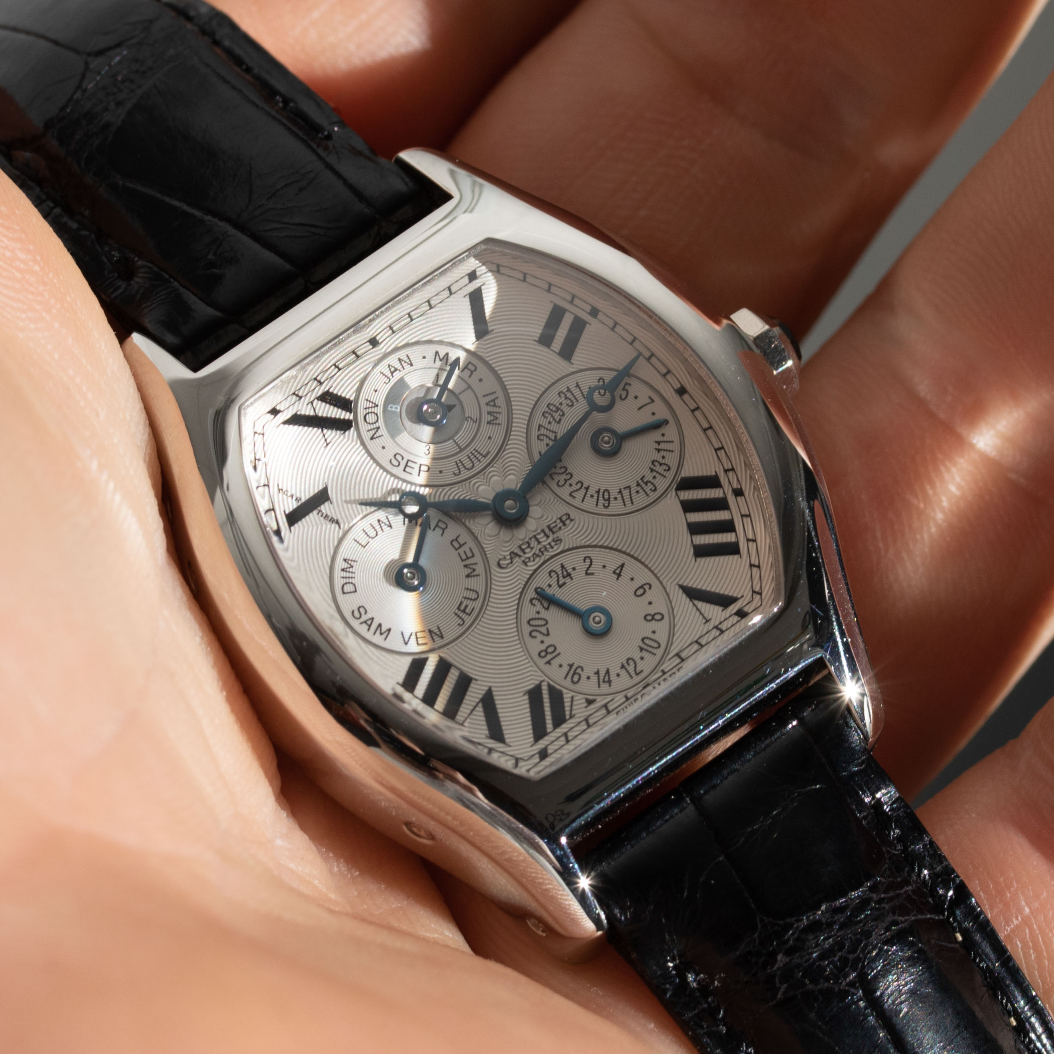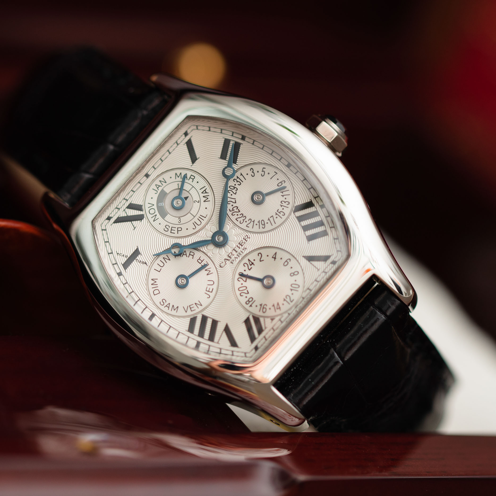 I had been looking to buy a perpetual calendar for a while, and the first ones I really liked were the ones from Audemars Piguet; round cases but different dial designs, which I saw from my friend Tom Chng (founder of the Singapore Watch Club). Some of them became very expensive due to the recent popularity of vintage APs (not only the Royal Oaks) and so I searched for some alternatives which would suit me. I am a big fan of the Cartier Tortue Monopoussoir with a white dial and blue details, the reference 2396 featuring a special movement developed by THA Ébauche. Since I like that case shape as well and I saw there was a platinum perpetual calendar version out there, I was immediately intrigued and started the search. The main reasons for buying this watch were 1: I wanted this perpetual calendar, 2: Cartier is growing on me as a brand, and 3: the price was right. So I took the opportunity before I would regret it.