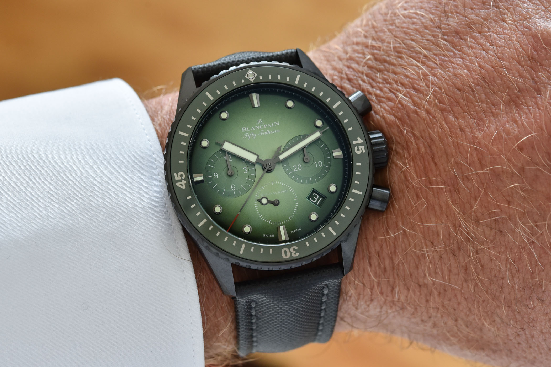 Quick Facts: 43.6mm diameter – black ceramic case – unidirectional green ceramic bezel with Liquidmetal markers – 300m water-resistant – gradient green dial – calibre F385, in-house – automatic 5Hz flyback chronograph with column wheel and vertical clutch – black NATO or sail canvas strap – 5200-0153-B52A – CHF 16,000 – blancpain.com