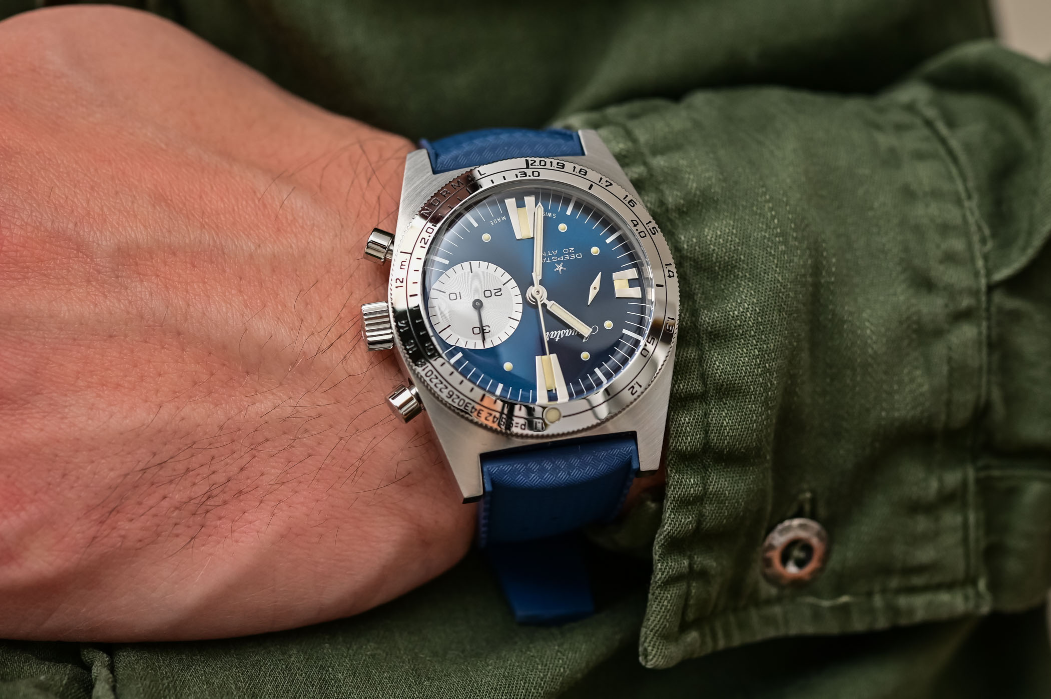 I just grabbed a Graham Prodive, blue and yellow. Ratcheted bezel, with date at 9, large lumed 30 minute counter at 7, awesome continuous lumed pinwheel at 4. One levered fly back at 9 . Pre loved at $3 grand, whoops, almost forgot , chrono functions at 600 meters . If you have some xtra scratch and can rock a 230 gram , on a strap beast, that you willNEVER see on another’s wrist, I highly recommend the Prodive. Cheers