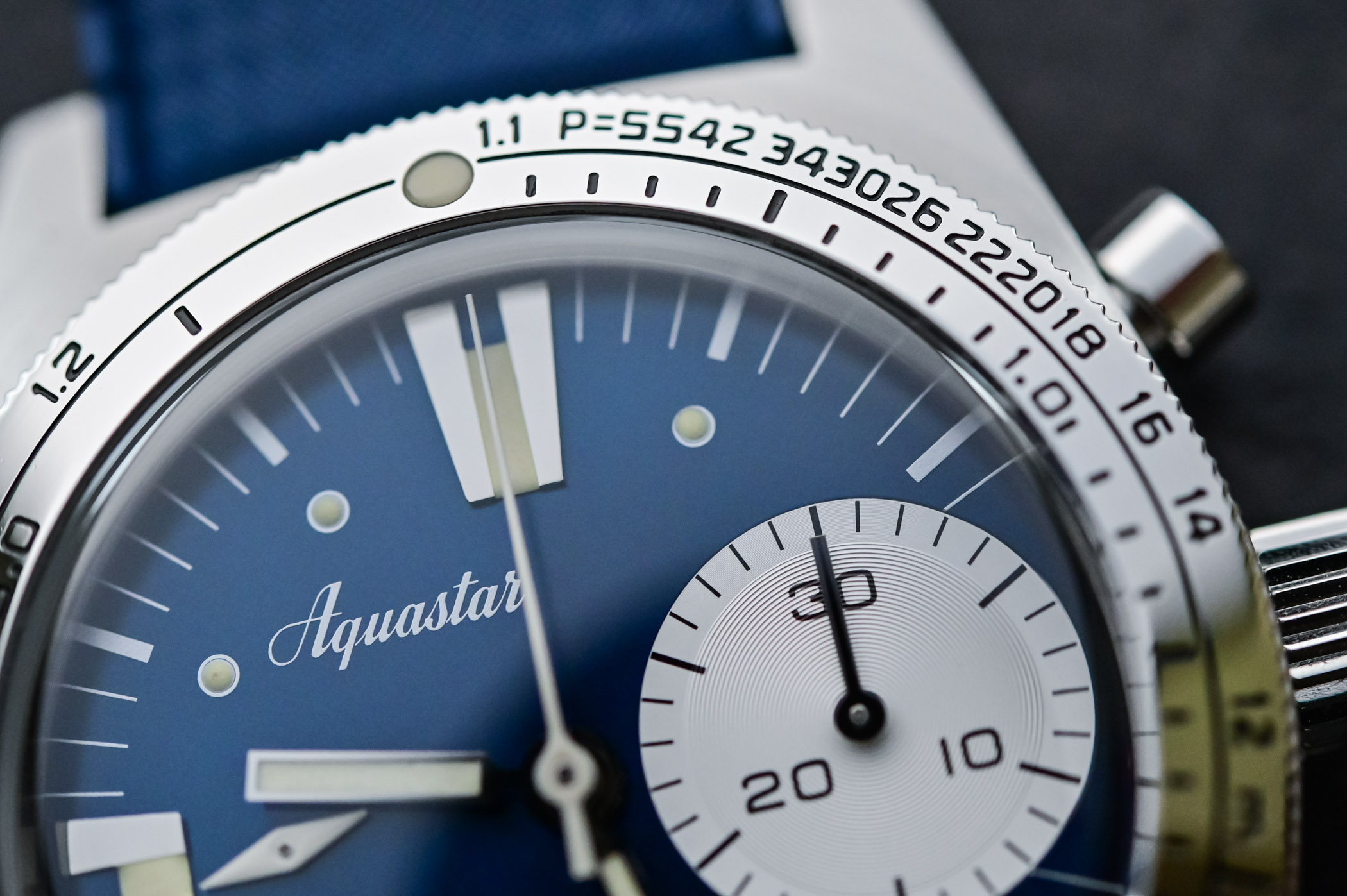 Quick facts: 40.5mm diameter – stainless steel case – bidirectional rotating bezel with Successive/Multiple dive non-decompression table calculator – 200m water-resistant – sunray-brushed dial in blue, grey or black – La Joux-Perret movement, base 7750 – automatic bi-compax chronograph with column wheel – Tropic rubber strap – USD 3,590 – aquastar.ch