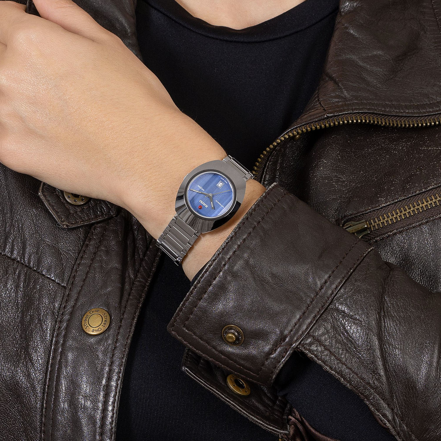 Rado’s signature moving anchor is featured at noon, and there is a rectangular date window at 6 o’clock, outlined in the colour of the dial. The dial has no indices, and the rhodium-plated hour and minute hands have a slim streak of luminescent material. Like the original Diastar, the dial is protected by a faceted sapphire crystal.