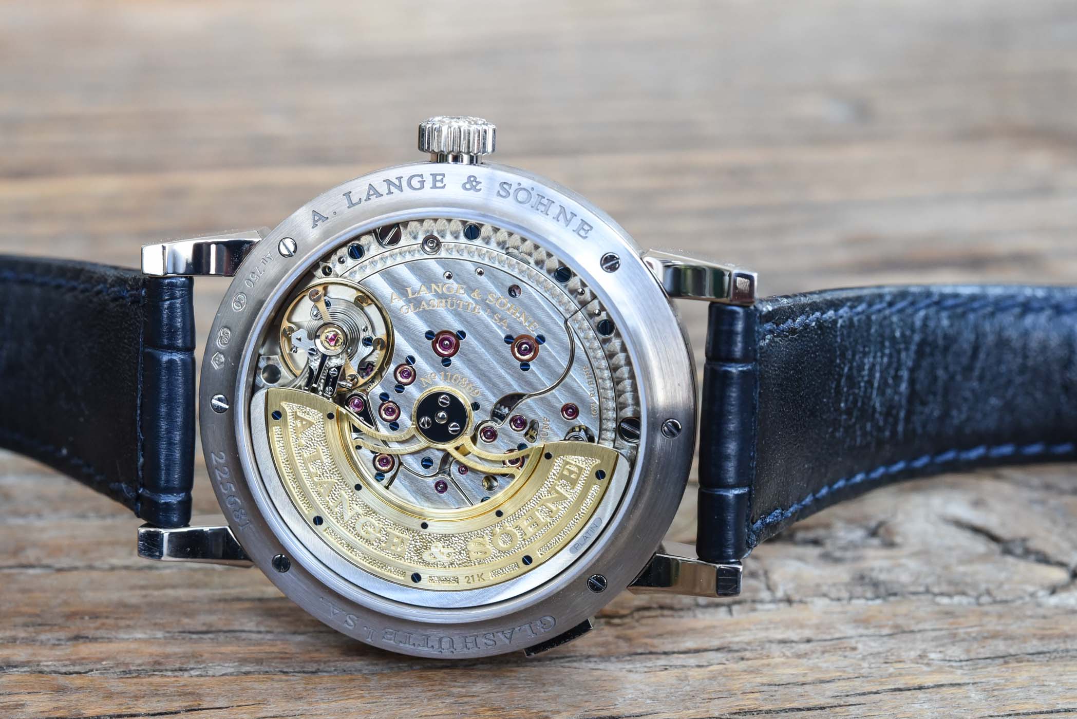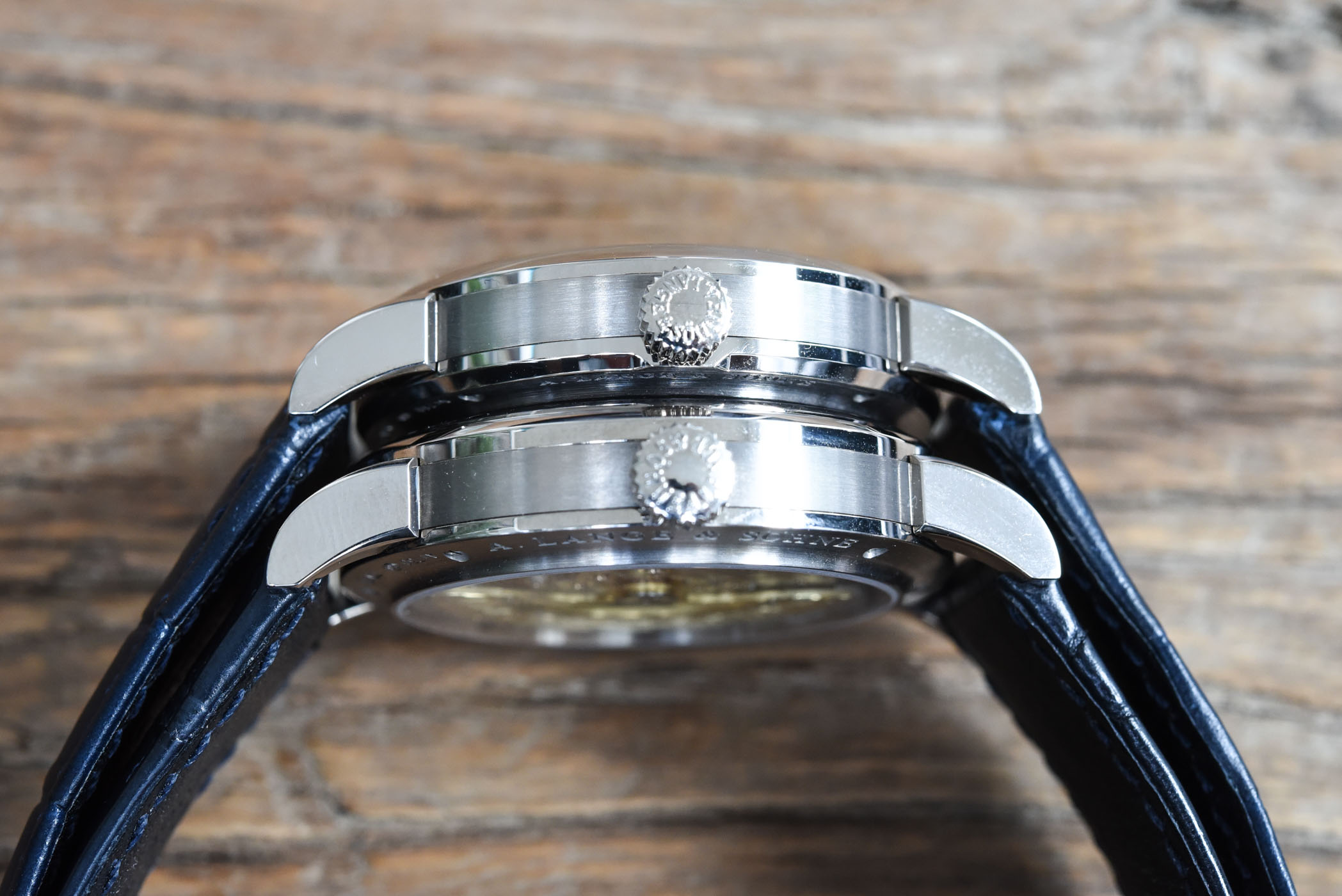 The finishing of the case is also equal on both watches. Polished bezels and lugs, straight brushed casebands, polished line around the caseback and circular brushed caseback… Again, virtually no differences here. We have the same shapes for the lugs (with Lange’s typical recess when the lugs meet the case and a bevel on the external side), the crown has the same shape and design (even though the Daymatic is slightly larger, to meet with the “thicker” case) and there’s the same pusher at 10 o’clock to adjust the date. Once again, not enough here to clearly differentiate these two watches. Both are equally beautiful, equally shaped, equally elegant and restrained… and equally Lange!