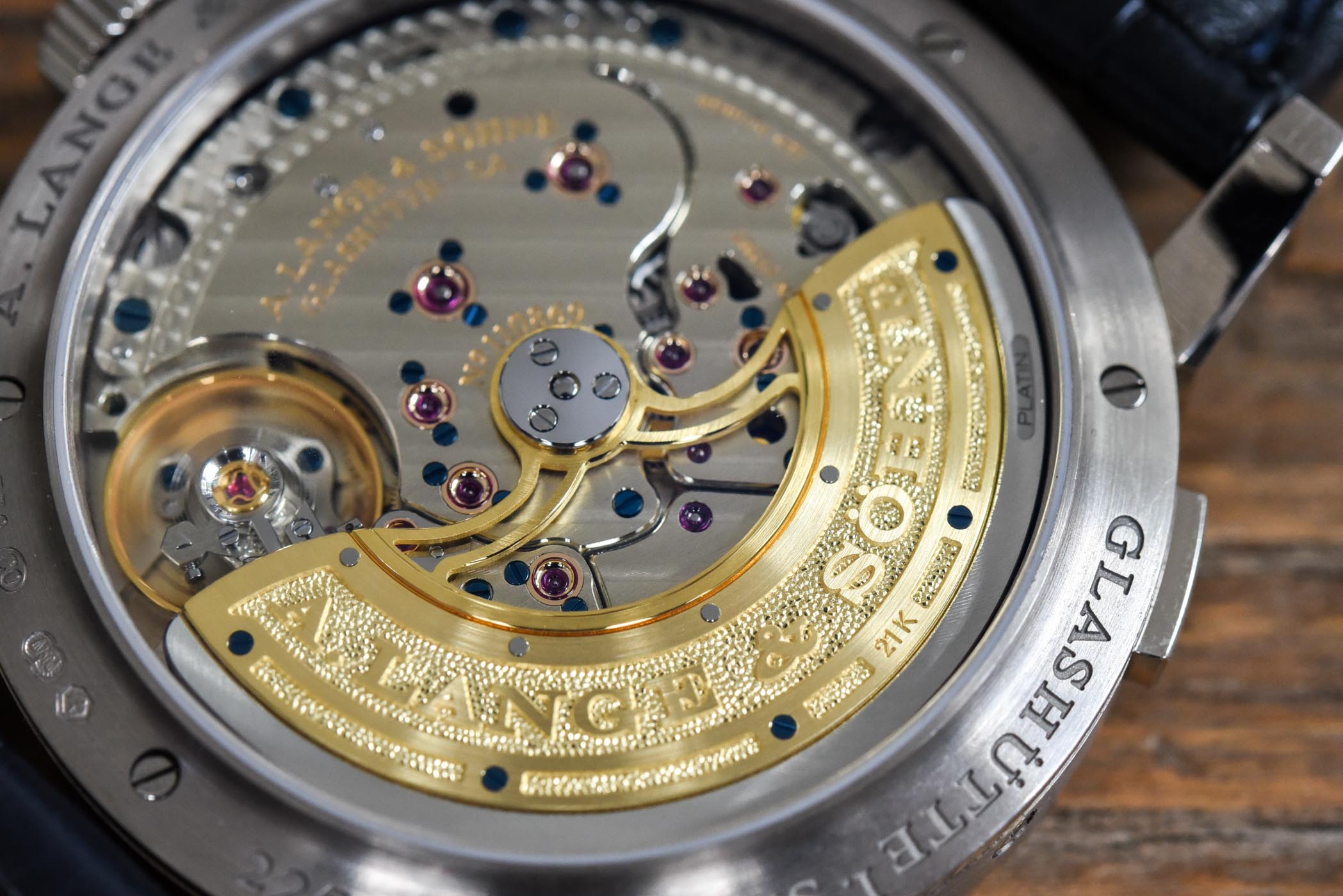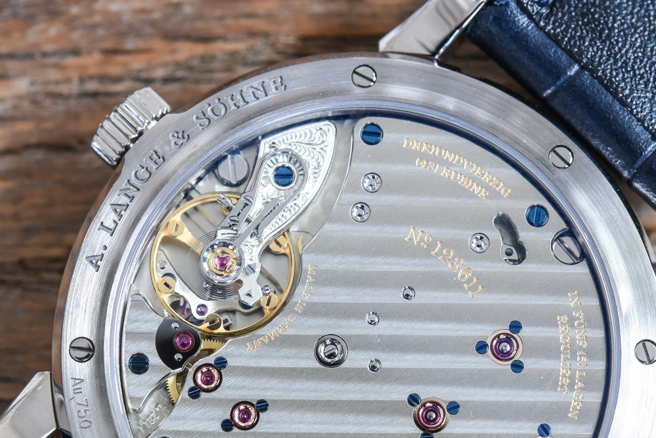 If both movements result in an overall equal (yet mirrored) display, the way to achieve this is entirely different. On one side is the Lange 1, equipped with a manual movement with “Doppelfederhaus” – a not-so-poetic word to indicate the presence of a double mainspring. This movement, even though it looks familiar, is entirely new, compared to the calibre that equipped the Lange 1 in 1994 – it was introduced alongside the subtle facelift done by A. Lange & Söhne on its icon in 2015 (incl. subtle changes on the bezel and the inscriptions). A closer look at this movement reveals much more modern mechanics, still with a familiar look. As we explained in this comparison of the old and new Lange 1, it has a brand-new architecture (a bit larger but a bit thinner), a new in-house balance wheel, a new date mechanism and revised decoration.