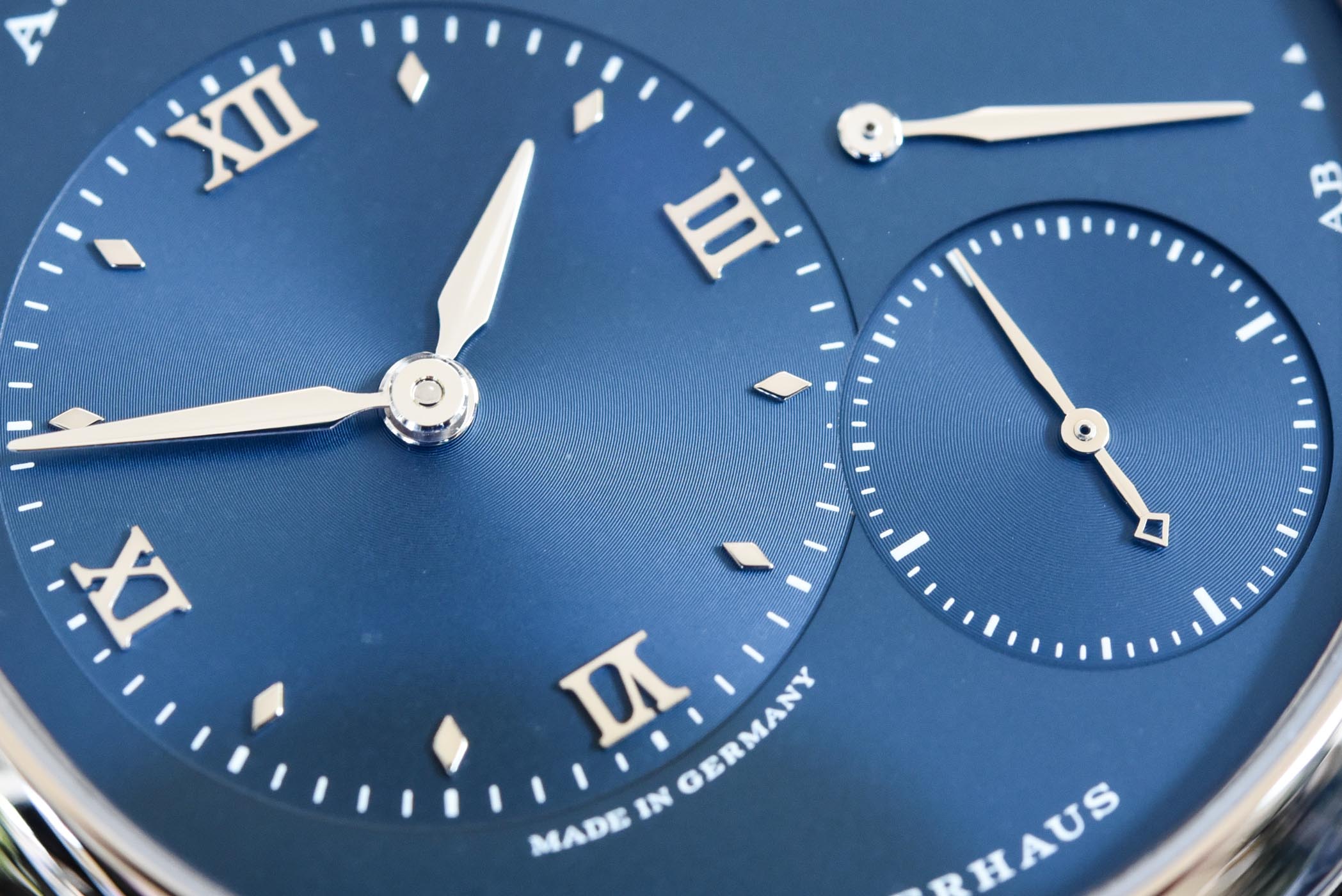 Both the Lange 1 and the Lange 1 Daymatic we had for this review were fitted with blue dials – these are part of a one-year-only production run, so if you’re interested in one, be fast. There is no difference in terms of colours and treatment, and both watches have a dark blue dial with a galvanized treatment, which produces a metallic colour – an especially playful tone of blue.