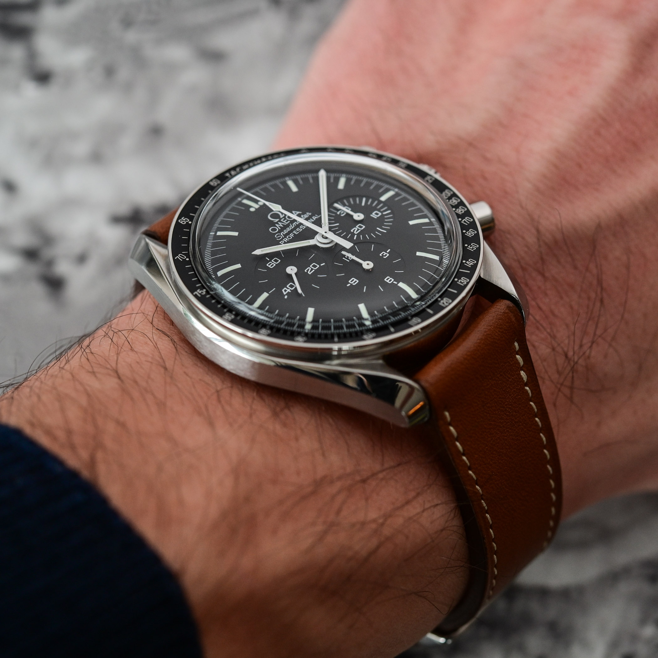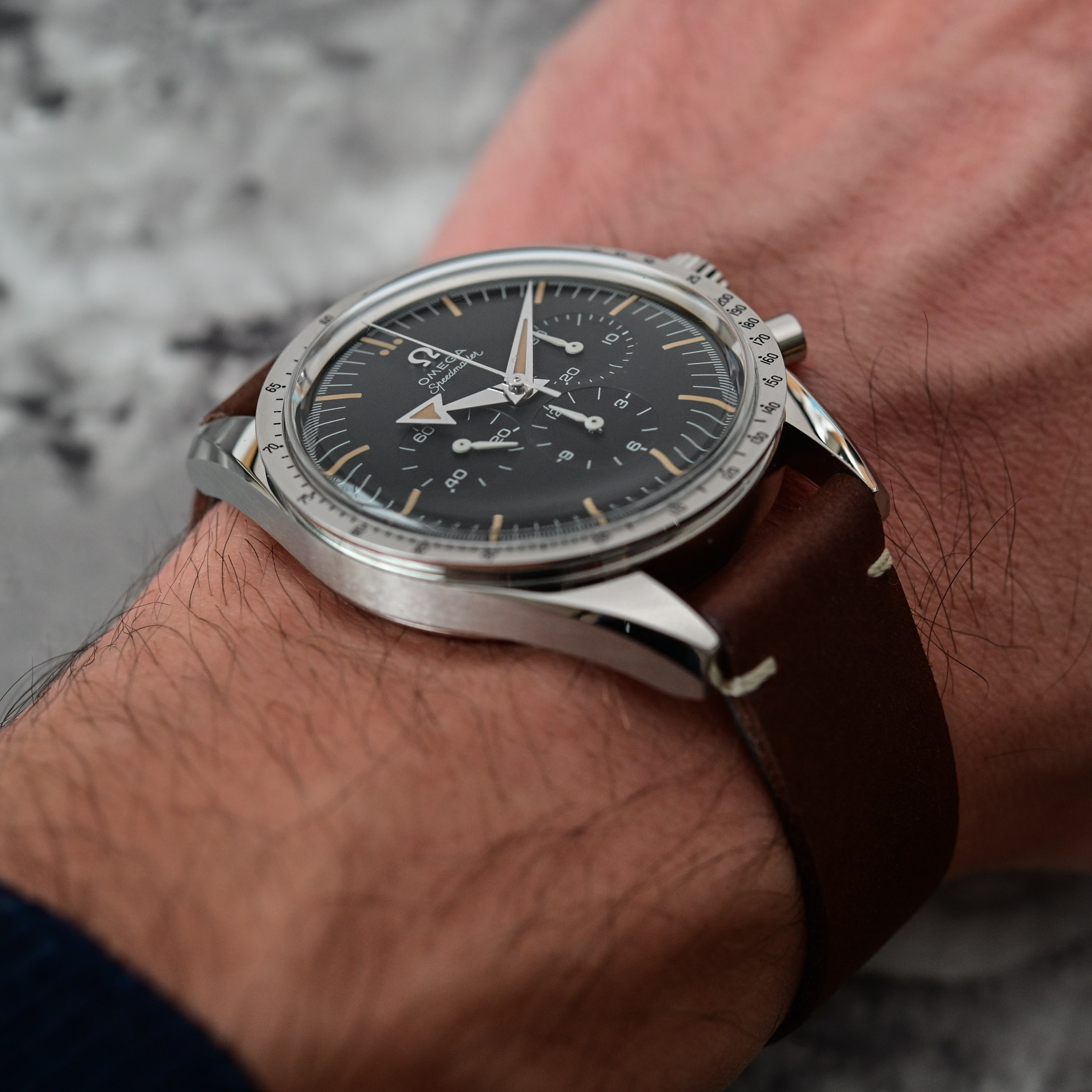 As for the Speedmaster 60th anniversary, Omega delivered the watch with a brushed and polished flat-link bracelet that tried to mimic the look and feel of the original bracelets found on the CK2915. Once again of an impeccable execution, with adjustment screws and micro-adjustment clasp, the result is visually less convincing in my books. Too thick, too wide at the buckle, too heavy, too modern in its execution, it doesn’t bring the desired vintage feel to this watch. However, the Speedmaster 60th anniversary was delivered new with two additional straps; the brown leather strap you see here and a grey NATO strap. Here, the Speedmaster Moonwatch Calibre 321 does a better job with its thin steel bracelet.