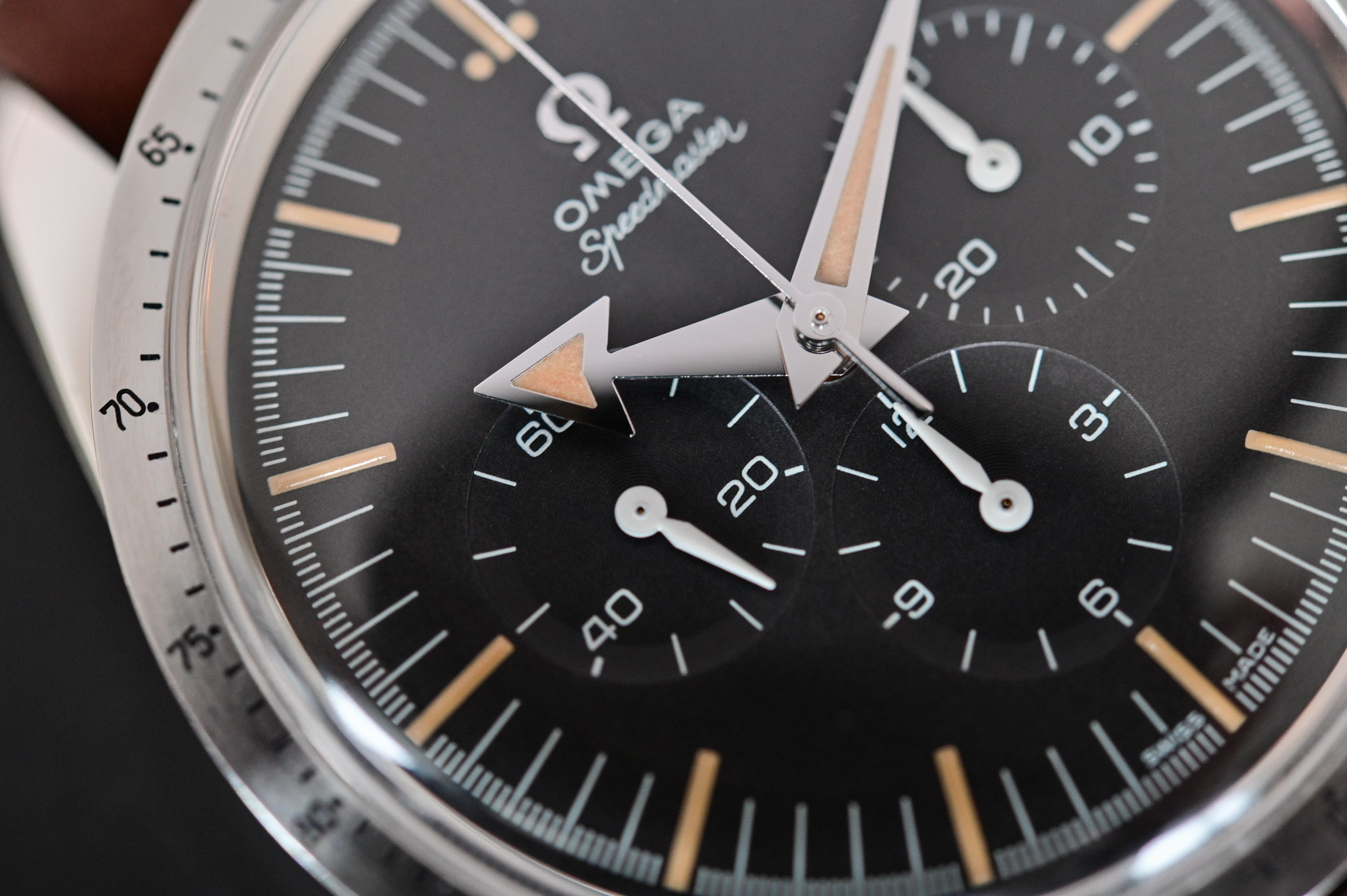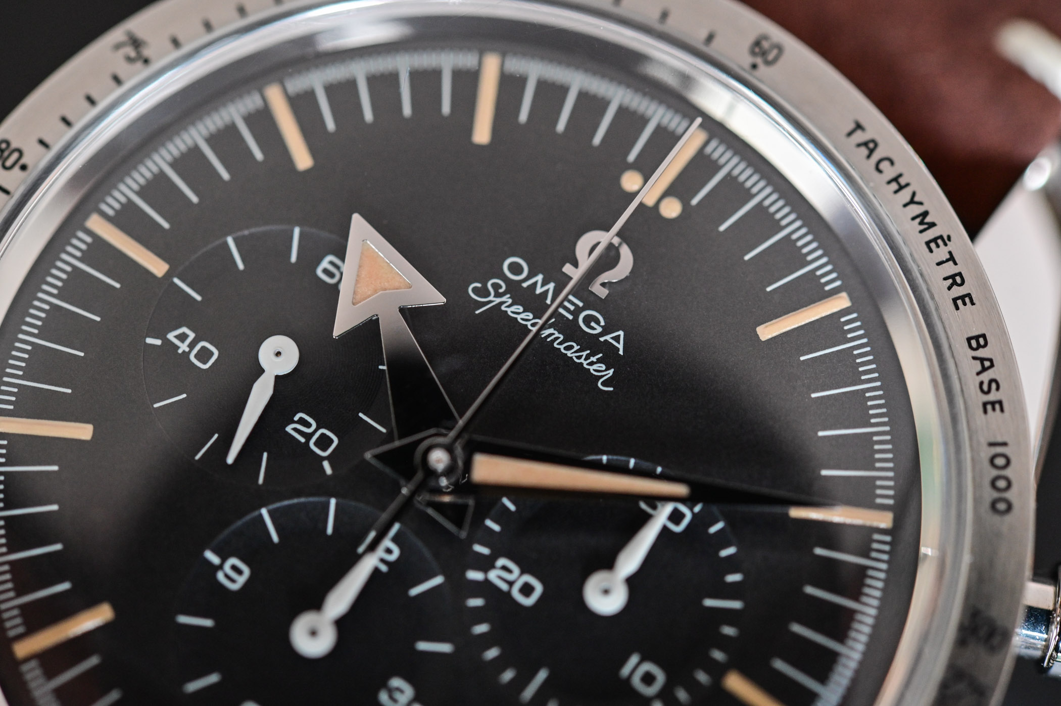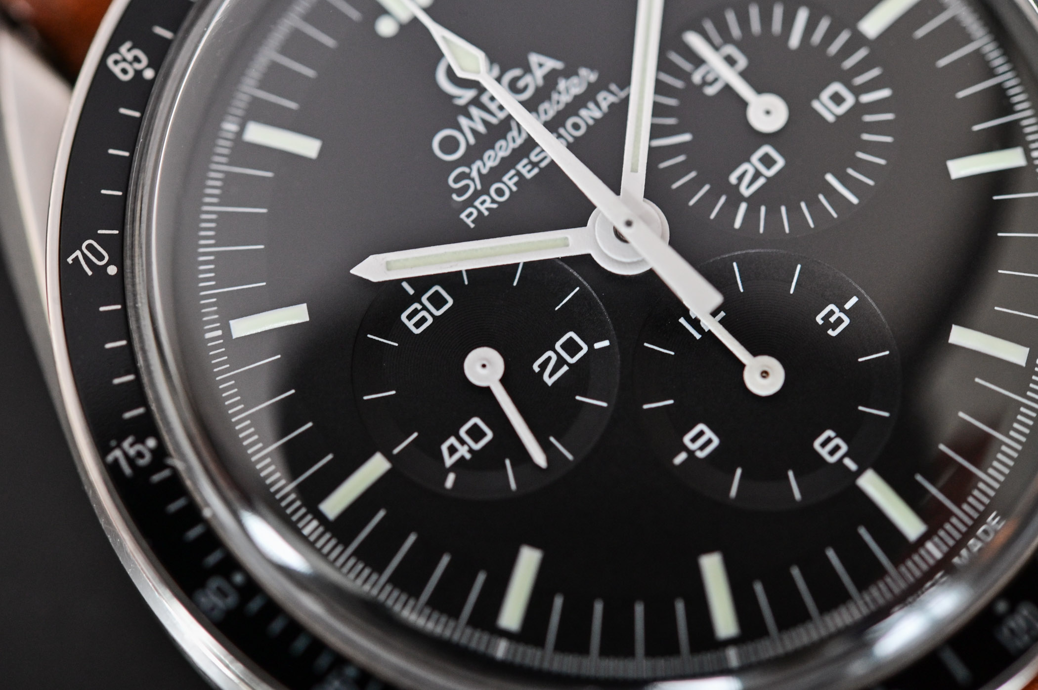 Then, there are the broad arrow hands, a highly important and distinctive element of the first generation Speedmaster, of course, re-created here. Again, when using them on a daily basis and due to their polished surface, you understand why Omega moved to white professional hands, as they are simply more practical. However, these broad arrow hands are so iconic and so unique to this watch that they are one of the major elements to be loved here. In the same vein, the small hands of the sub-counters are so-called Alpha and are painted white, proving great contrast. Overall, an impressive job by Omega in terms of faithfulness and execution.