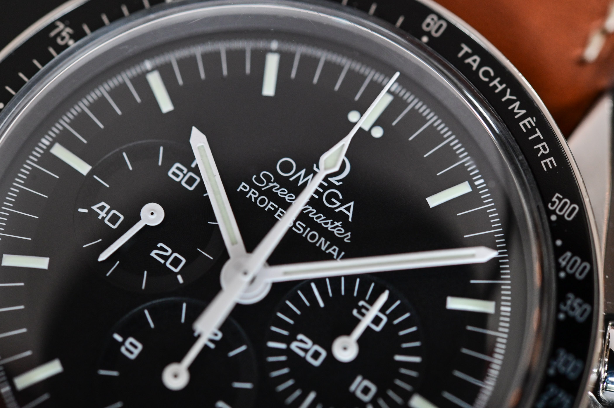 Here, we can easily assume that most watch enthusiasts, even the most novice of us, will know what they’ll be looking at. The Moonwatch Professional is a classic amongst the classics, and a perfect demonstration of form follows function, the result of multiple years of successive upgrades. The dial of this 3750.50 is basically the same as used by the brand since the mid-1970s, with some exceptions, such as the fonts and, of course, the use of LumiNova. Entirely focused on legibility, this apparent simplicity is the result of multiple tests in previous generation watches, and its monochromatic minimalism makes for one of the most versatile watches on the market. Timeless, ultra-functional, it is one of the most focused chronographs available. No wonder why it was used in space. The matte black surface features greenish-white luminescent material, short markers, white tracks and hands and everything feels natural to use.