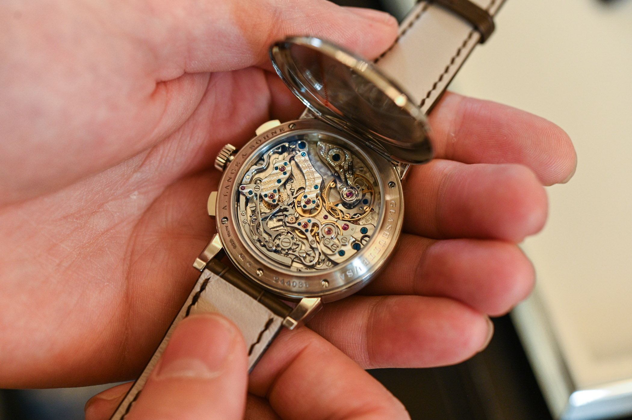 The chronograph subdials are finished in a deep brown colour, which matches surprisingly well with the rose gold-tone of the dial. As mentioned, the case is made in white gold and has a hinged caseback, also known as a cuvette. This is an element we’ve seen on the previous prize watches created for the Concorso’s winner. Engraved with the event’s emblem, it reveals the complex manufacture calibre L951.5. This intricate movement has a great deal of visual depth as a result of its construction. And as always, all components, even the once’s you can’t see, are refinished to perfection. For all the details and specifications, we refer you to our in-depth story on the 1815 Chronograph Boutique Edition.