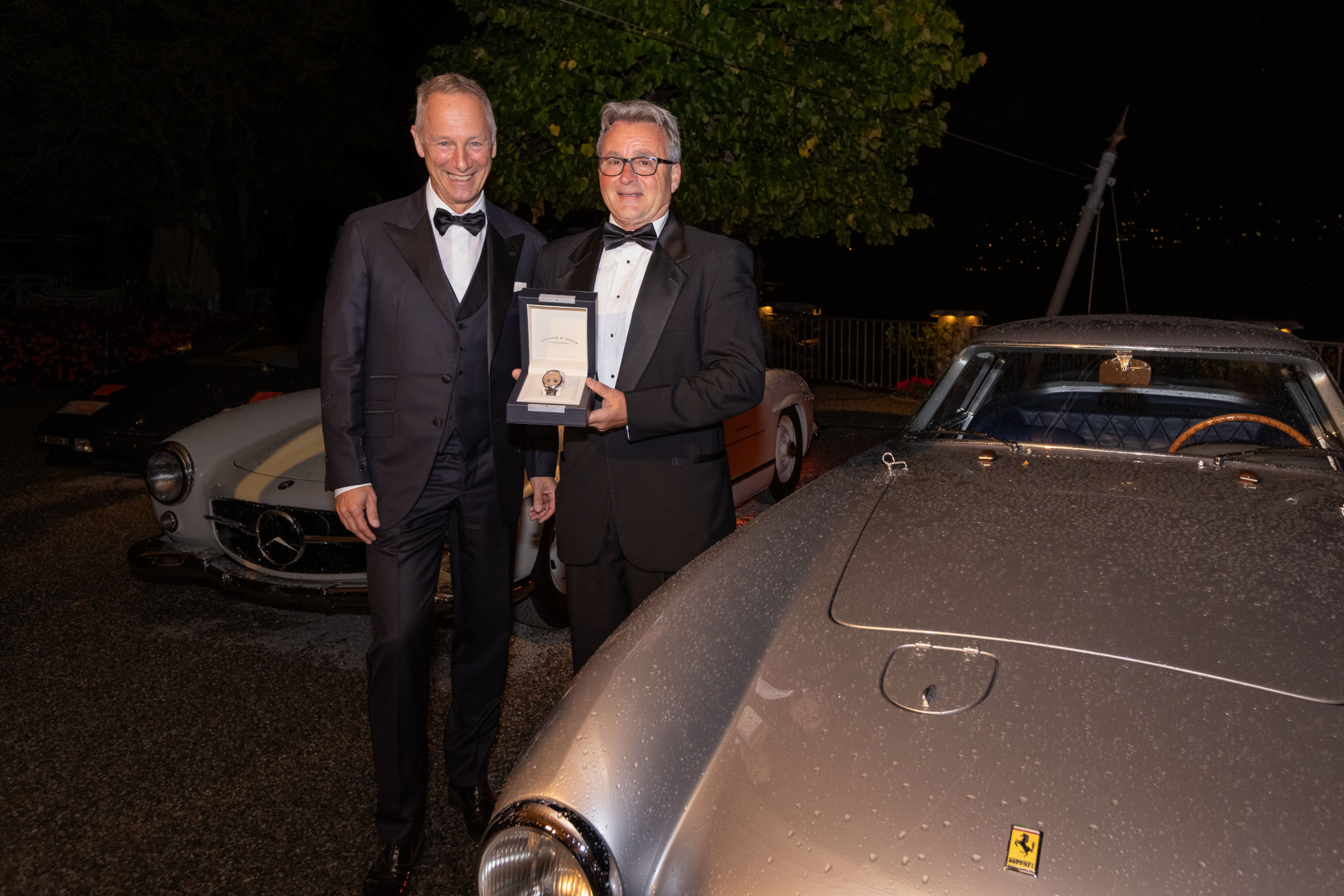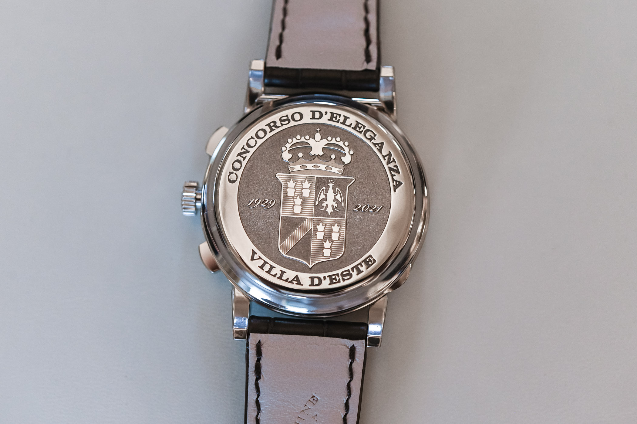 On the occasion of announcing the Ferrari 250 GT TdF as Best of Show, a unique A. Lange & Söhne 1815 Chronograph was gifted to Brian Ross, the car’s owner. Wilhelm Schmid, CEO for A. Lange & Söhne and bonafide car enthusiast, personally handed over the specially created timepiece. This unique watch comes with several stand-out elements not seen in any other A. Lange & Söhne. The watch has a salmon-coloured dial set in a white gold case with a special hinged cuvette covering the movement. The cover is hand-engraved with the Concorso d’Eleganza Villa d’Este coat of arms.