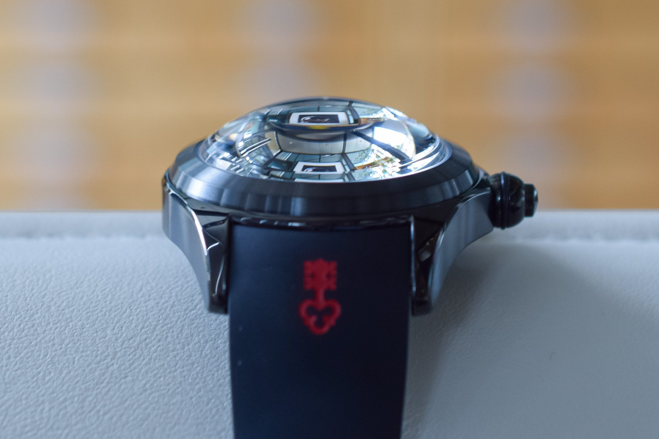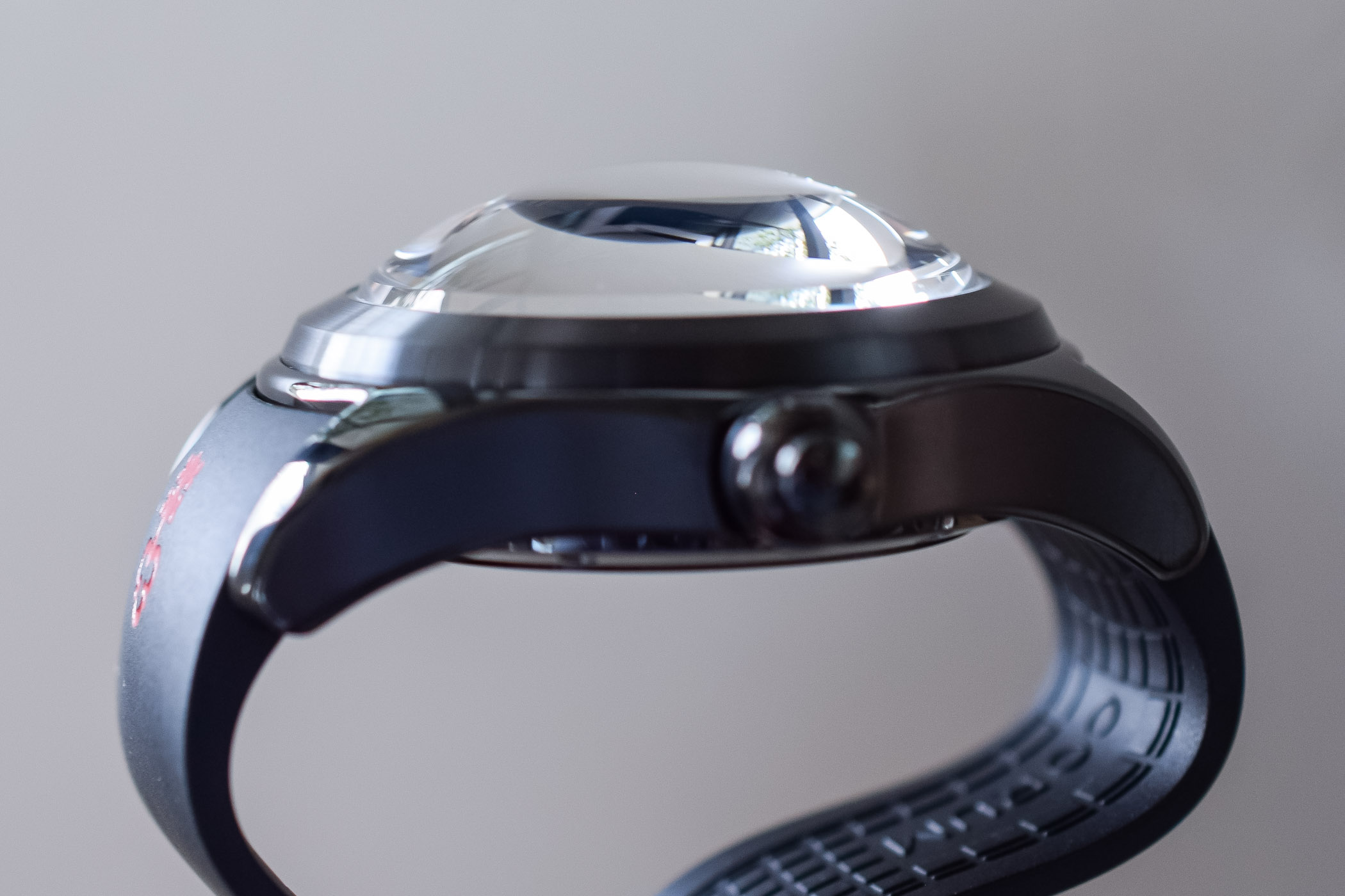 The Corum Bubble Shark Mono-Pusher Chronograph is worn on a black rubber strap embossed with red ‘Corum key’ logos. It is secured with a PVD-steel pin buckle.